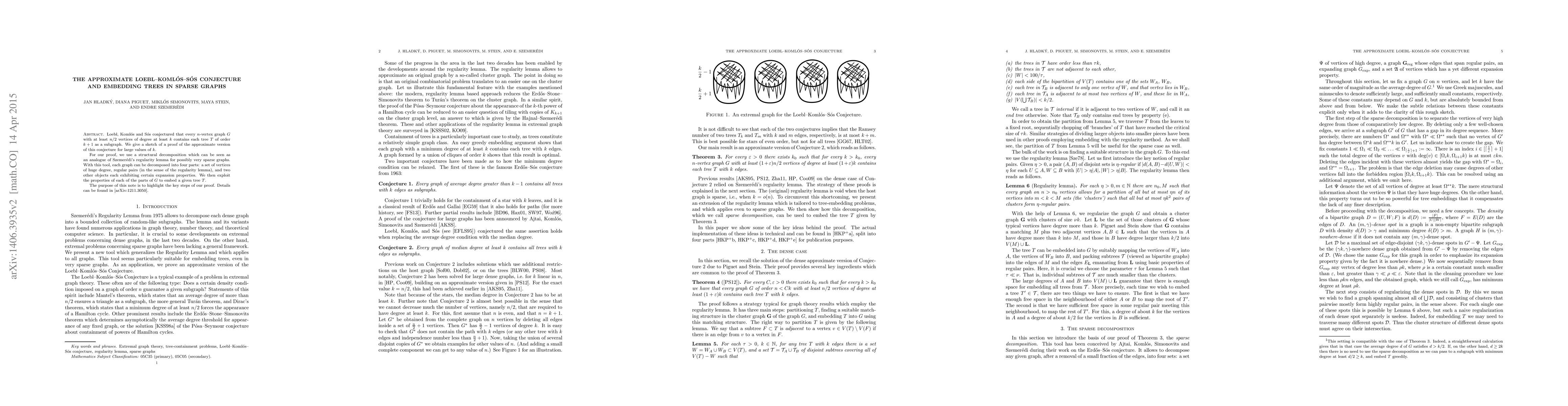 Loebl, Koml\'os and S\'os conjectured that every $n$-vertex graph $G$ with at least $n/2$ vertices of degree at least $k$ contains each tree $T$ of order $k+1$ as a subgraph. We give a sketch of a proof of the approximate version of this conjecture for large values of $k$. For our proof, we use a structural decomposition which can be seen as an analogue of Szemer\'edi's regularity lemma for possibly very sparse graphs. With this tool, each graph can be decomposed into four parts: a set of vertices of huge degree, regular pairs (in the sense of the regularity lemma), and two other objects each exhibiting certain expansion properties. We then exploit the properties of each of the parts of $G$ to embed a given tree $T$. The purpose of this note is to highlight the key steps of our proof. Details can be found in [arXiv:1211.3050].