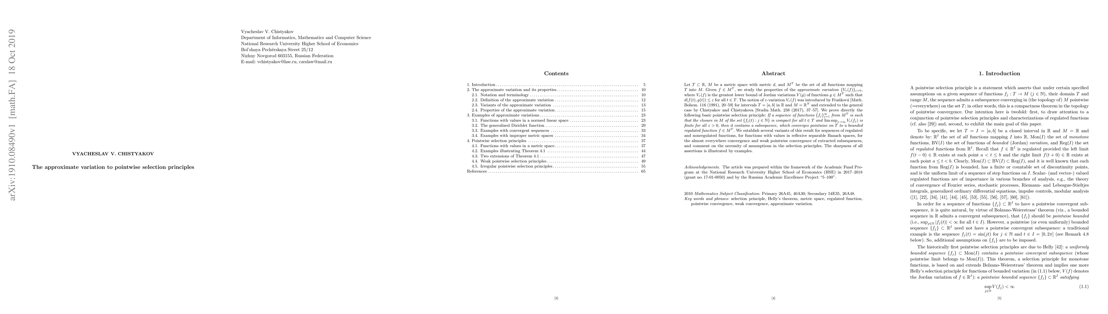 This paper investigates the properties of approximate variation and proves a pointwise selection principle for sequences of functions. It establishes that under certain compactness and finite variation conditions, a subsequence converges pointwise to a regulated function, with variants for different types of functions and convergence modes.
