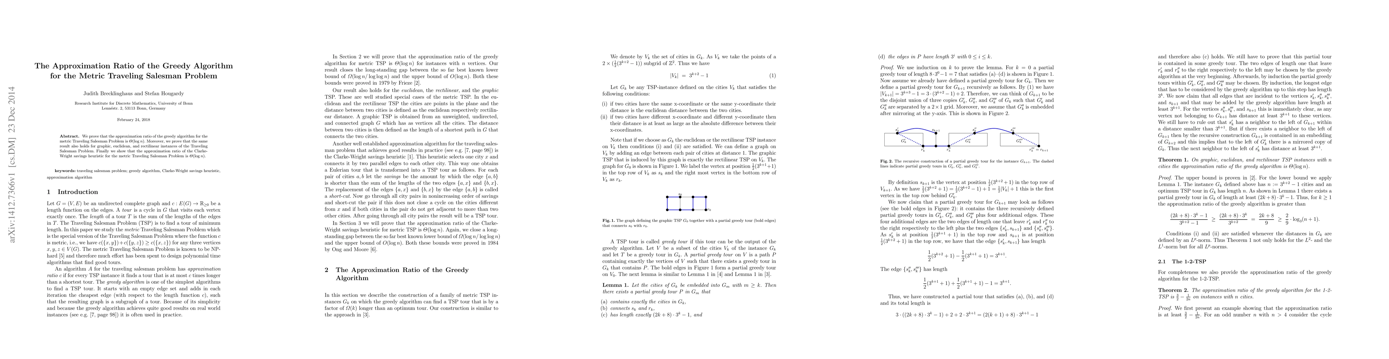 The paper proves the approximation ratio of the greedy algorithm for the Metric Traveling Salesman Problem (TSP) is Θ(log n), extending this result to graphic, Euclidean, and rectilinear instances of TSP. It also establishes the same approximation ratio for the Clarke-Wright savings heuristic.