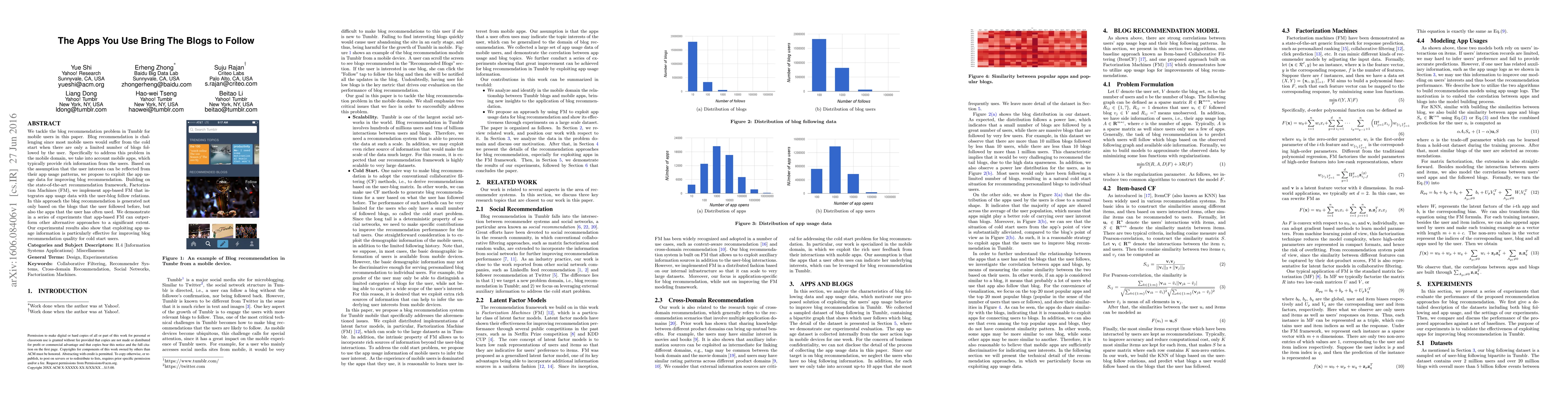 We tackle the blog recommendation problem in Tumblr for mobile users in this paper. Blog recommendation is challenging since most mobile users would suffer from the cold start when there are only a limited number of blogs followed by the user. Specifically to address this problem in the mobile domain, we take into account mobile apps, which typically provide rich information from the users. Based on the assumption that the user interests can be reflected from their app usage patterns, we propose to exploit the app usage data for improving blog recommendation. Building on the state-of-the-art recommendation framework, Factorization Machines (FM), we implement app-based FM that integrates app usage data with the user-blog follow relations. In this approach the blog recommendation is generated not only based on the blogs that the user followed before, but also the apps that the user has often used. We demonstrate in a series of experiments that app-based FM can outperform other alternative approaches to a significant extent. Our experimental results also show that exploiting app usage information is particularly effective for improving blog recommendation quality for cold start users.