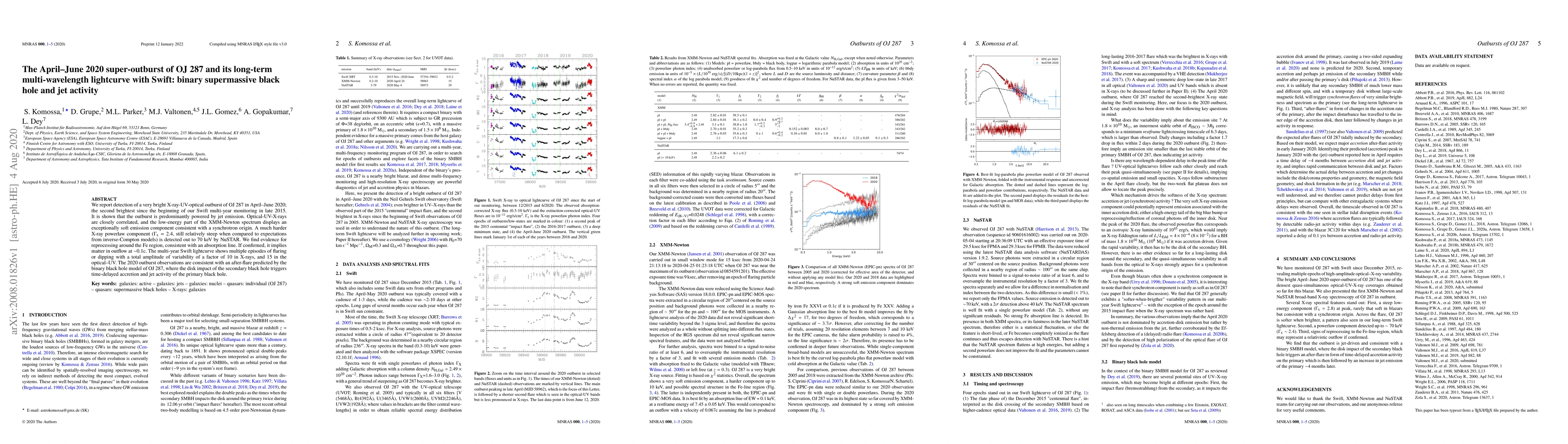 In April-June 2020, OJ 287, a binary supermassive black hole system, experienced a significant X-ray-UV-optical outburst, second brightest since 2015 monitoring. The outburst was primarily jet-powered, with soft synchrotron emission in low-energy X-rays and a steep hard X-ray component up to 70 keV. Multi-year Swift observations revealed extensive variability in X-rays and optical-UV, with potential evidence of matter moving at 10% of light speed. The 2020 flare aligns with predictions from the binary black hole model, suggesting secondary black hole impacts trigger primary black hole accretion and jet activity.