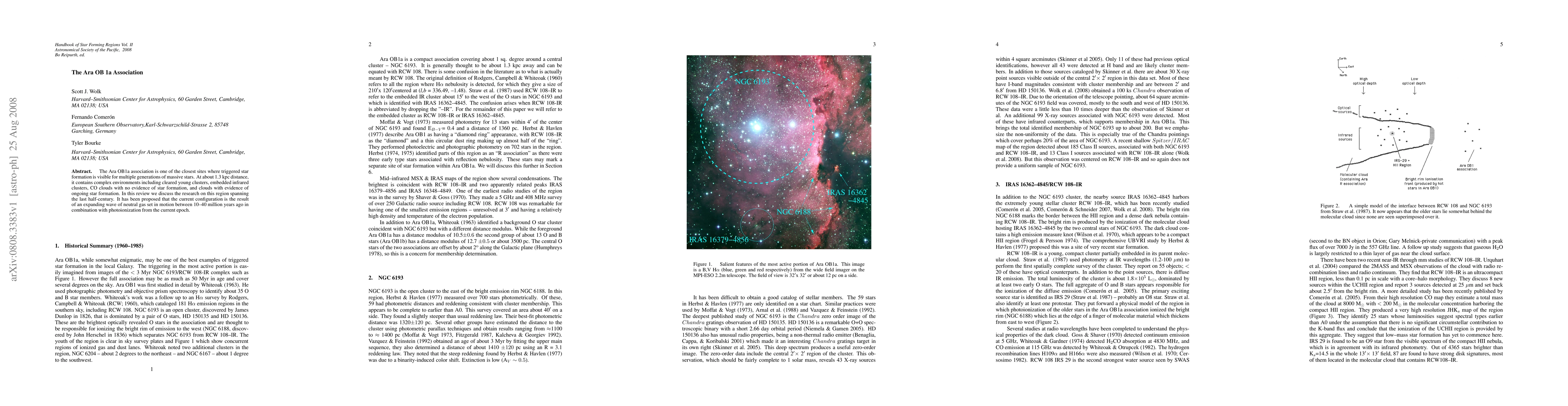 The Ara OB1a association, at 1.3 kpc, hosts a multi-generational triggered star formation visible in young clusters, embedded infrared clusters, and CO clouds. Research over 50 years suggests its current configuration resulted from an expanding neutral gas wave 10-40 million years ago, combined with current photoionization.