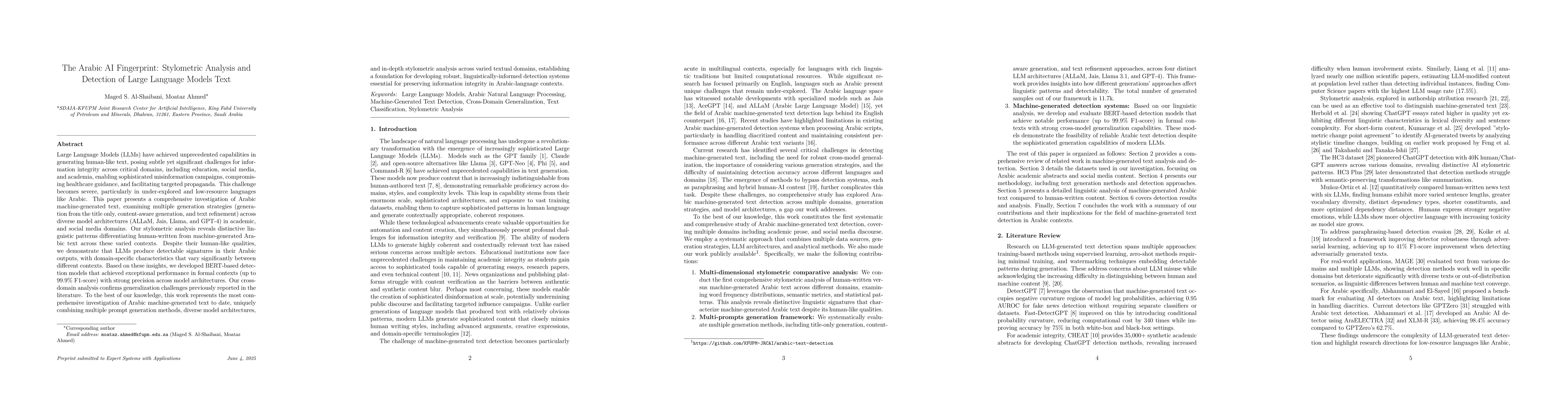 The paper presents a detailed stylometric analysis of Arabic machine-generated text and develops BERT-based detection models that achieve high performance in formal contexts.