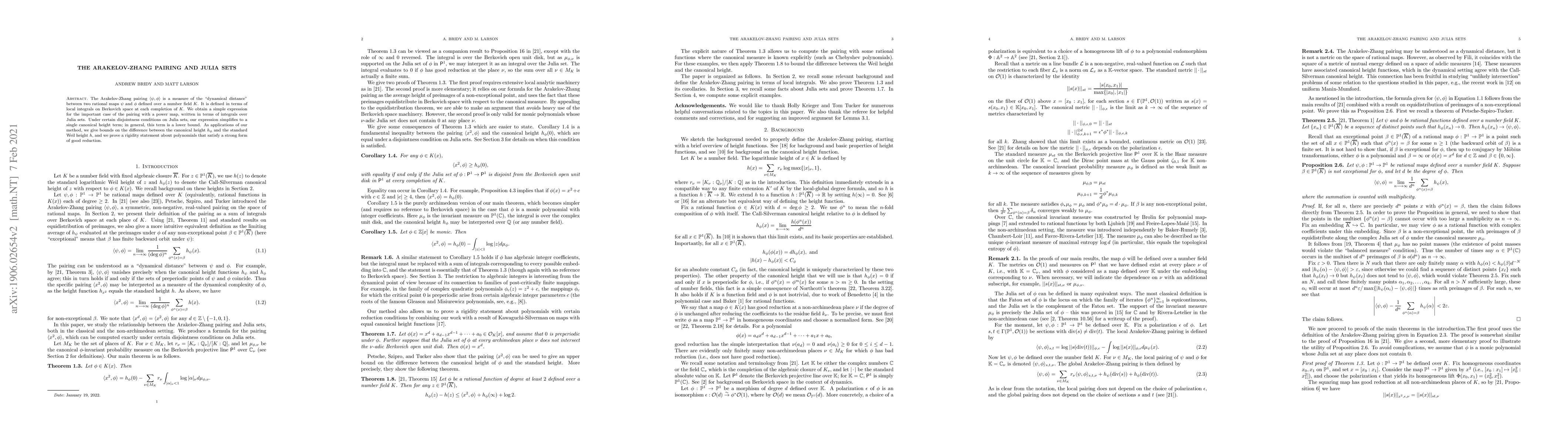 The Arakelov-Zhang pairing measures the dynamical distance between two rational maps, expressed via integrals over Julia sets. Under disjointness conditions, it simplifies to a canonical height term, providing bounds on the difference between canonical and Weil heights and proving rigidity for polynomials with good reduction.