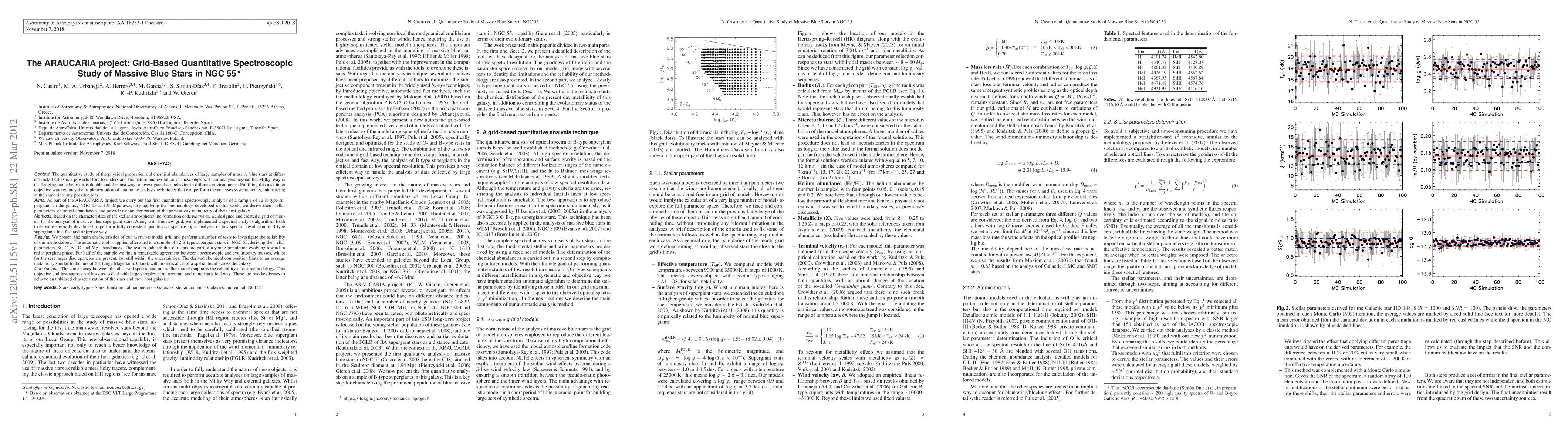 The ARAUCARIA project conducts a grid-based quantitative spectroscopic analysis of 12 B-type supergiants in NGC55, revealing their stellar parameters and chemical abundances using the FASTWIND model grid and automated spectral analysis. The study finds these stars are part of a young population with an average metallicity similar to the Large Magellanic Cloud.