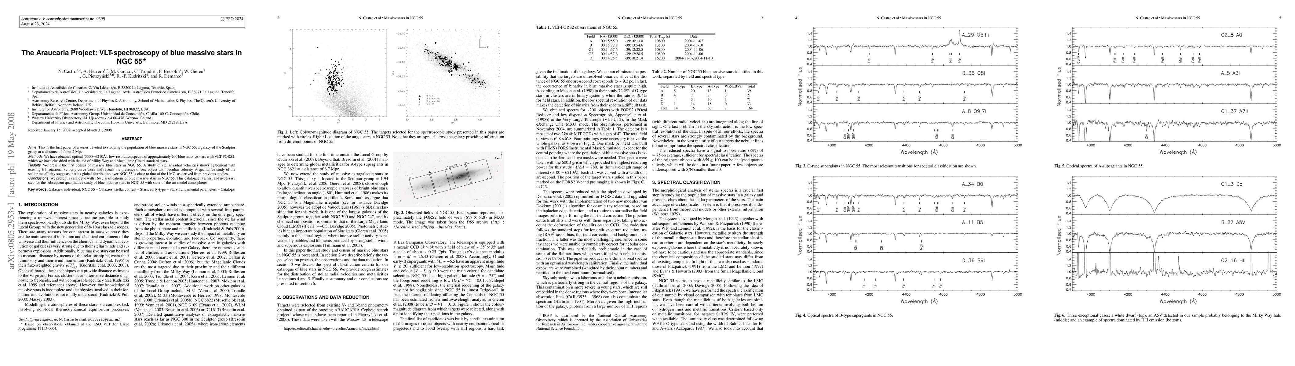 The Araucaria Project provides the first census of blue massive stars in NGC 55, utilizing VLT-spectroscopy, and reveals a stellar population with metallicity distribution similar to the Large Magellanic Cloud. The study also identifies one star with a peculiar velocity.