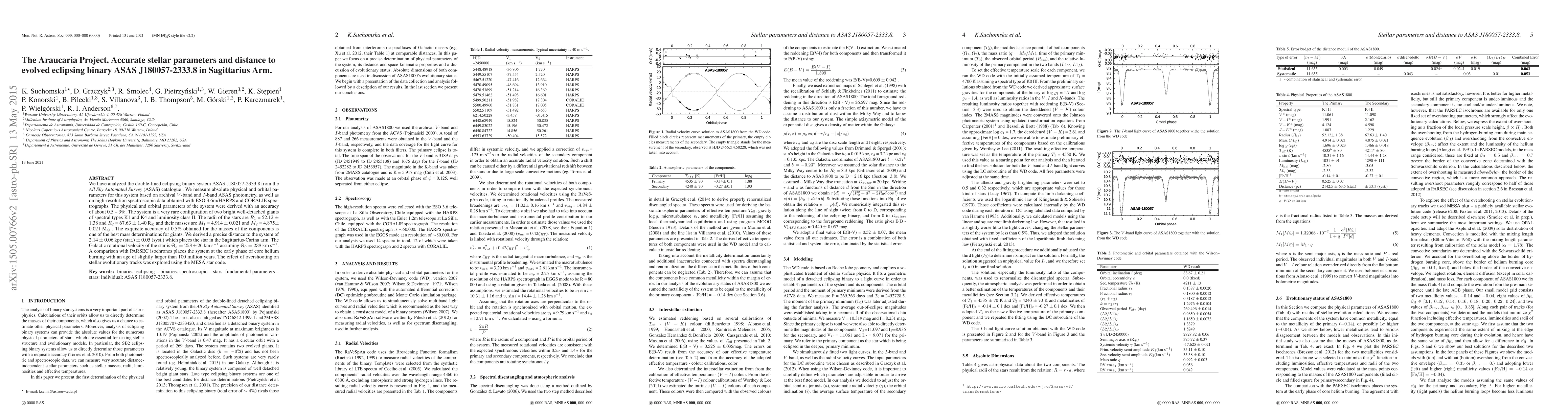 We have analyzed the double-lined eclipsing binary system ASAS J180057-2333.8 from the All Sky Automated Survey (ASAS) catalogue . We measure absolute physical and orbital parameters for this system based on archival $V$-band and $I$-band ASAS photometry, as well as on high-resolution spectroscopic data obtained with ESO 3.6m/HARPS and CORALIE spectrographs. The physical and orbital parameters of the system were derived with an accuracy of about 0.5 - 3%. The system is a very rare configuration of two bright well-detached giants of spectral types K1 and K4 and luminosity class II. The radii of the stars are $R_1$ = 52.12 $\pm$ 1.38 and $R_2$ = 67.63 $\pm$ 1.40 R$_\odot$ and their masses are $M_1$ = 4.914 $\pm$ 0.021 and $M_2$ = 4.875$\pm$ 0.021 M$_\odot$ . The exquisite accuracy of 0.5% obtained for the masses of the components is one of the best mass determinations for giants. We derived a precise distance to the system of 2.14 $\pm$ 0.06 kpc (stat.) $\pm$ 0.05 (syst.) which places the star in the Sagittarius-Carina arm. The Galactic rotational velocity of the star is $\Theta_s=258 \pm 26$ km s$^{-1}$ assuming $\Theta_0=238$ km s$^{-1}$. A comparison with PARSEC isochrones places the system at the early phase of core helium burning with an age of slightly larger than 100 million years. The effect of overshooting on stellar evolutionary tracks was explored using the MESA star code.