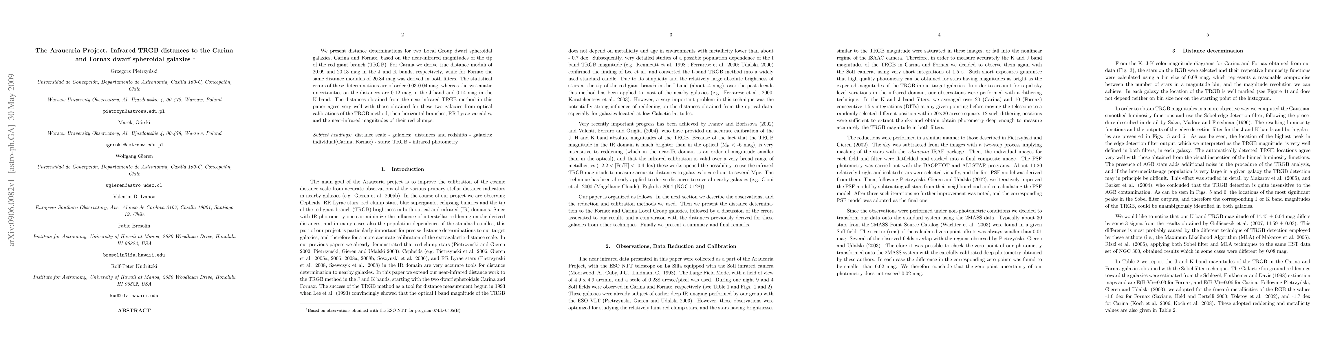 The Araucaria Project measures distances to Carina and Fornax dwarf galaxies using the near-infrared TRGB method, yielding moduli of 20.09-20.13 mag for Carina and 20.84 mag for Fornax, with small statistical and larger systematic uncertainties. These results align closely with previous optical calibrations.