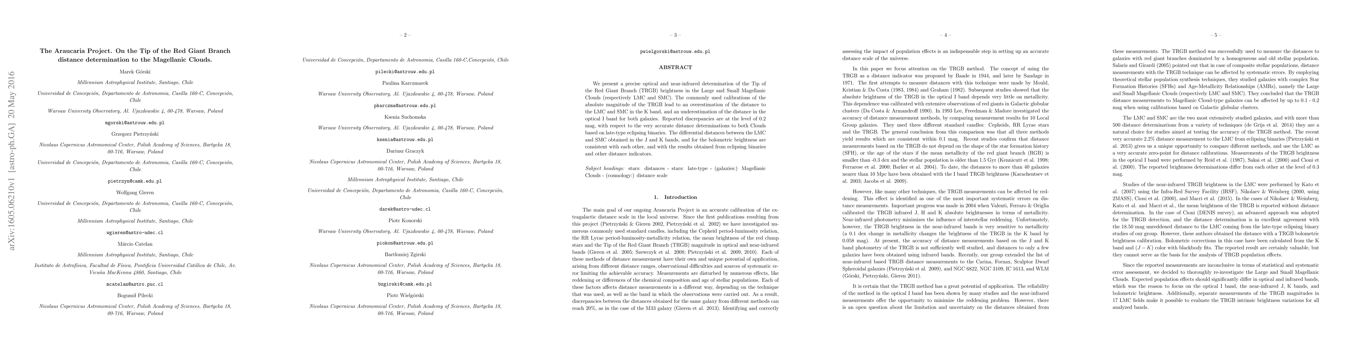 The Araucaria Project provides precise measurements of the Tip of the Red Giant Branch (TRGB) brightness in the Large and Small Magellanic Clouds, revealing discrepancies in commonly used calibrations that overestimate the LMC and SMC distances in the K band and underestimate them in the optical I band. The differential distances derived from J and K bands align with results from eclipsing binaries and other indicators.