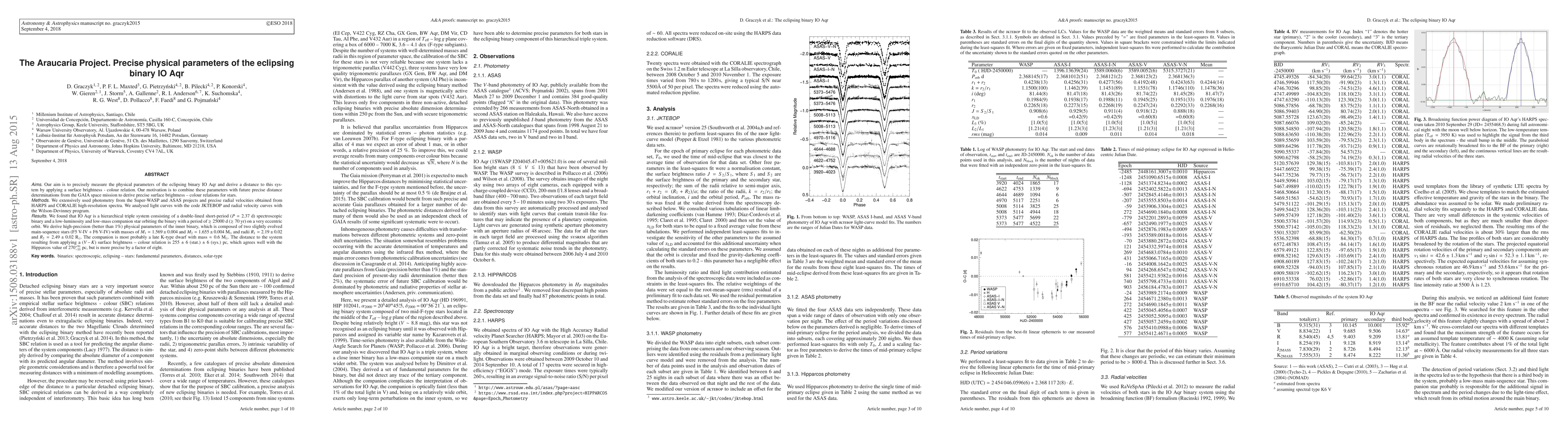 The Araucaria Project precisely measures IO Aqr's physical parameters, revealing it's a hierarchical triple system with a short-period inner binary of two F-type main-sequence stars and a low-mass, low-luminosity companion. The study uses Super-WASP, ASAS photometry, and HARPS/CORALIE spectra, deriving 1% precision in masses and radii, and a distance of 255±6 pc, more precise than Hipparcos' value.