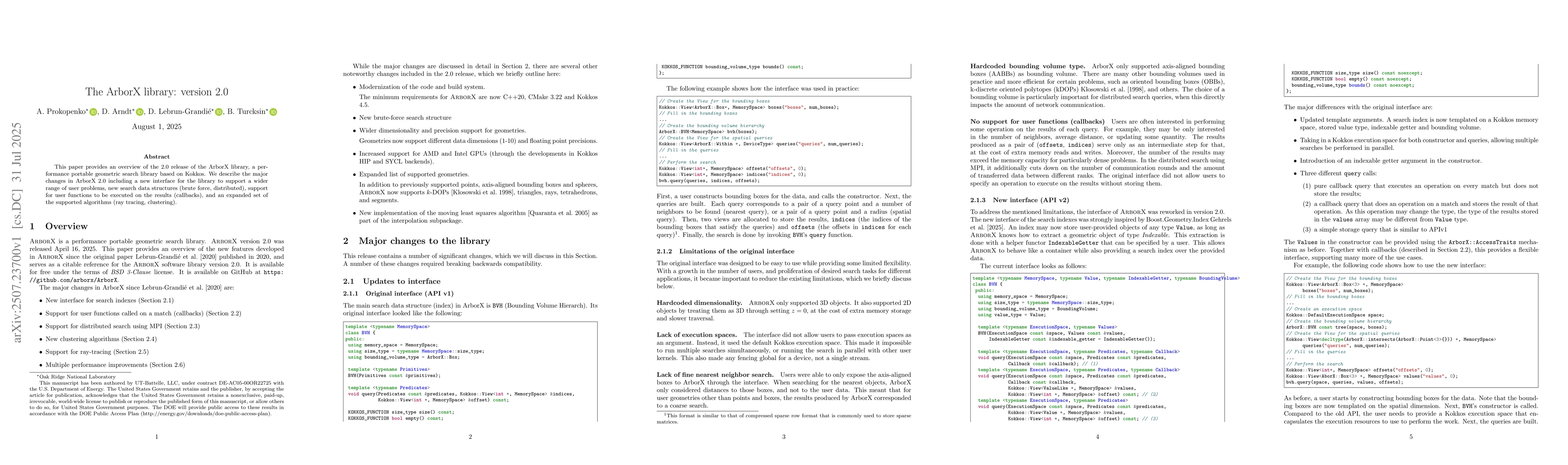 The paper describes the 2.0 release of the ArborX library, focusing on major changes such as a new interface for broader user problem support, new search data structures (brute force, distributed), support for user functions (callbacks), and expanded algorithm support (ray tracing, clustering).