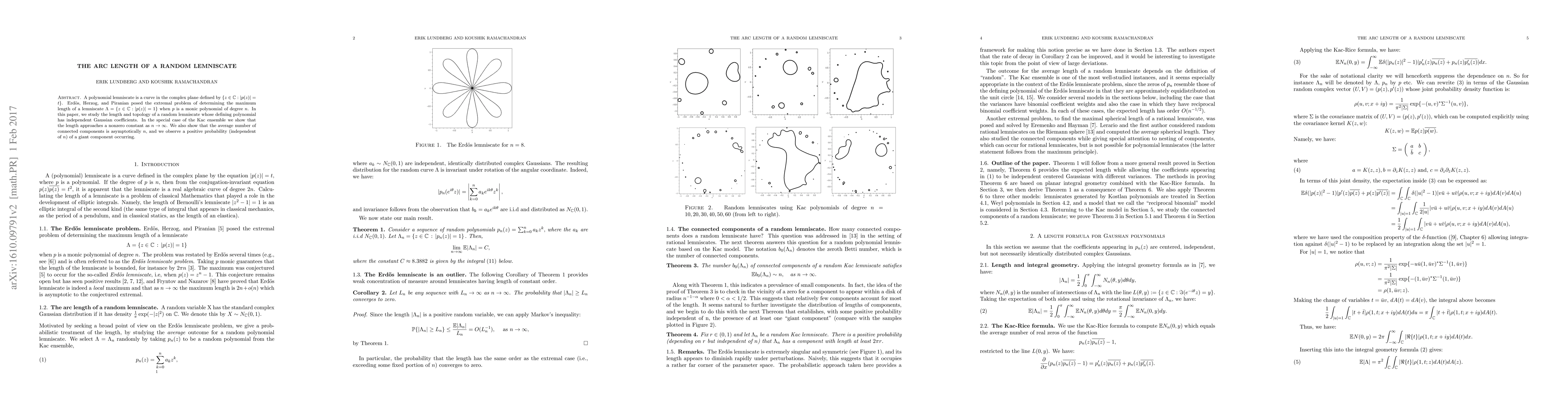 Researchers studied the length and topology of random lemniscates with Gaussian coefficients, finding that some properties approach a limit as the polynomial degree increases, while others exhibit a giant component with positive probability.