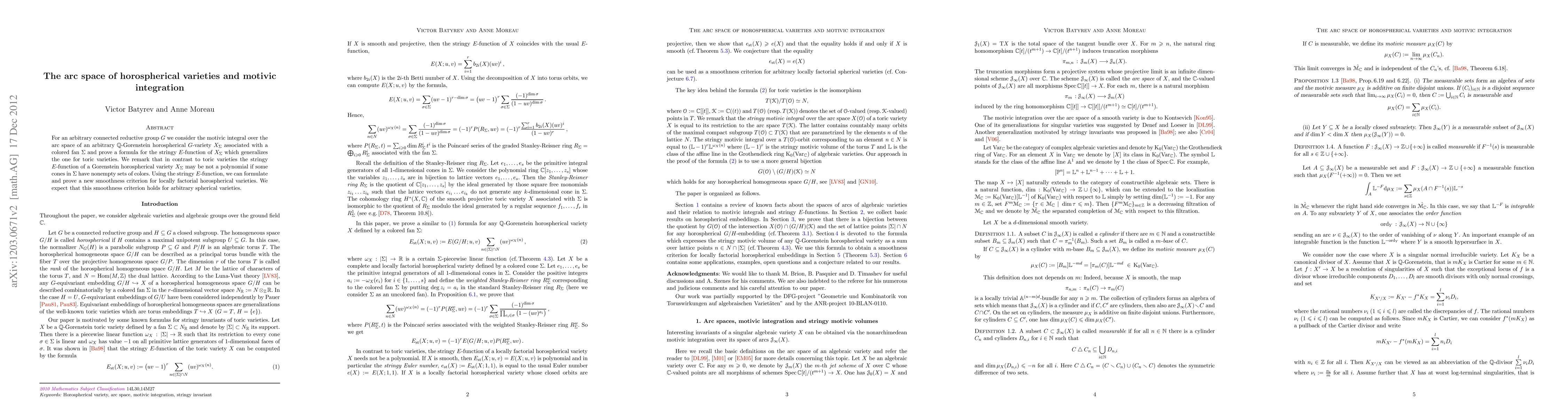 For arbitrary connected reductive group G we consider the motivic integral over the arc space of an arbitrary Q-Gorenstein horospherical G-variety associated with a colored fan and prove a formula for the stringy E-function of a horospherical variety X which generalizes the one for toric varieties. We remark that in contrast to toric varieties the stringy E-function of a Gorenstein horospherical variety X may be not a polynomial if some cones in the fan of X have nonempty sets of colors. Using the stringy E-function, we can formulate and prove a new smoothness criterion for locally factorial horospherical varieties. We expect that this smoothness criterion holds for arbitrary spherical varieties.
