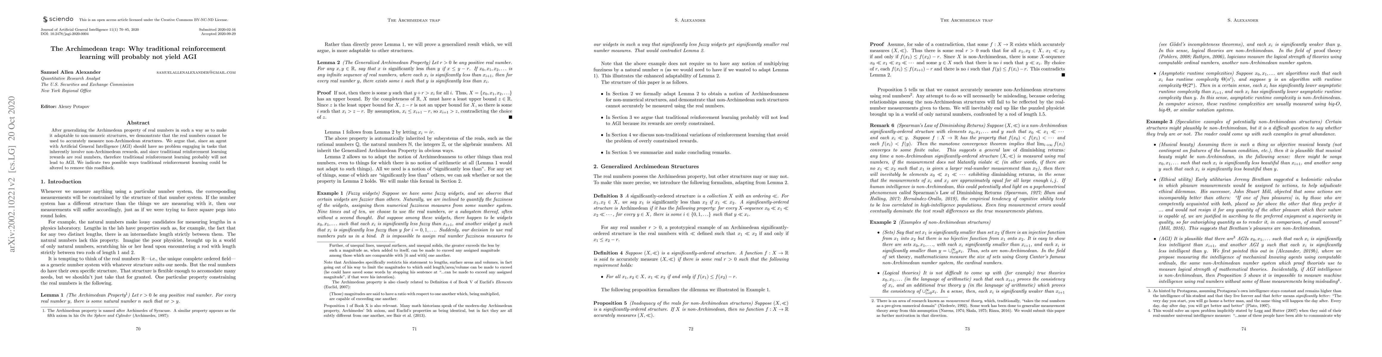 After generalizing the Archimedean property of real numbers in such a way as to make it adaptable to non-numeric structures, we demonstrate that the real numbers cannot be used to accurately measure non-Archimedean structures. We argue that, since an agent with Artificial General Intelligence (AGI) should have no problem engaging in tasks that inherently involve non-Archimedean rewards, and since traditional reinforcement learning rewards are real numbers, therefore traditional reinforcement learning probably will not lead to AGI. We indicate two possible ways traditional reinforcement learning could be altered to remove this roadblock.