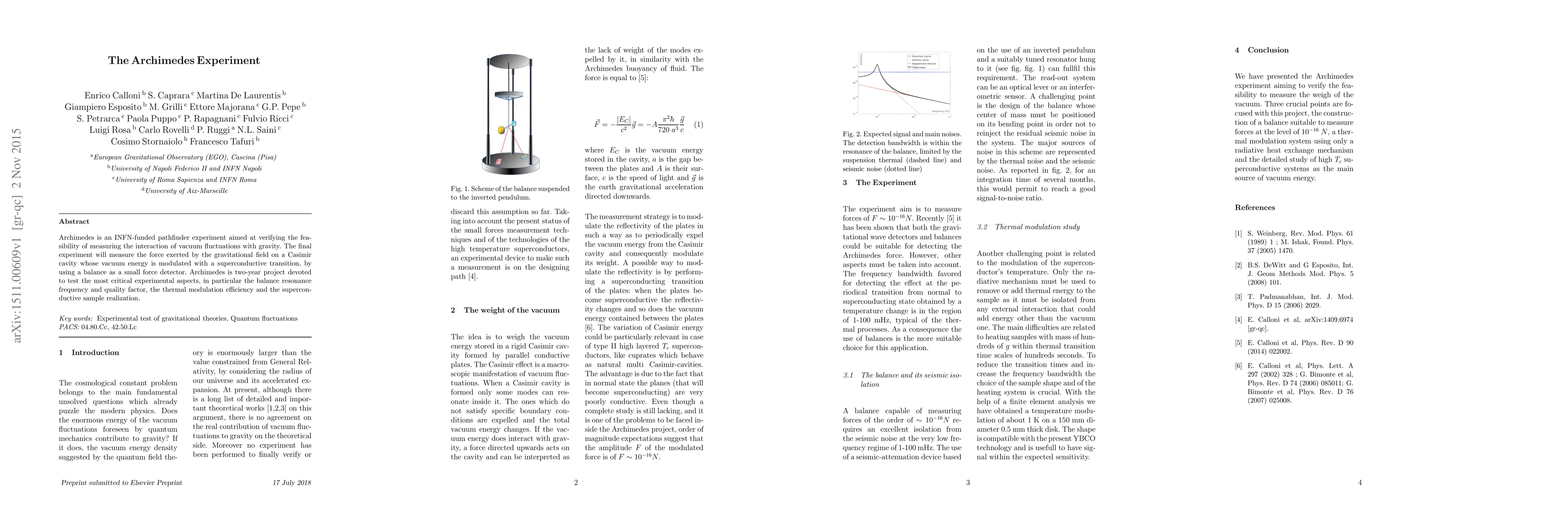 The Archimedes experiment aims to measure the interaction of vacuum fluctuations with gravity by detecting the force exerted on a Casimir cavity modulated by superconductive transitions. The project focuses on testing critical experimental aspects for a two-year endeavor.
