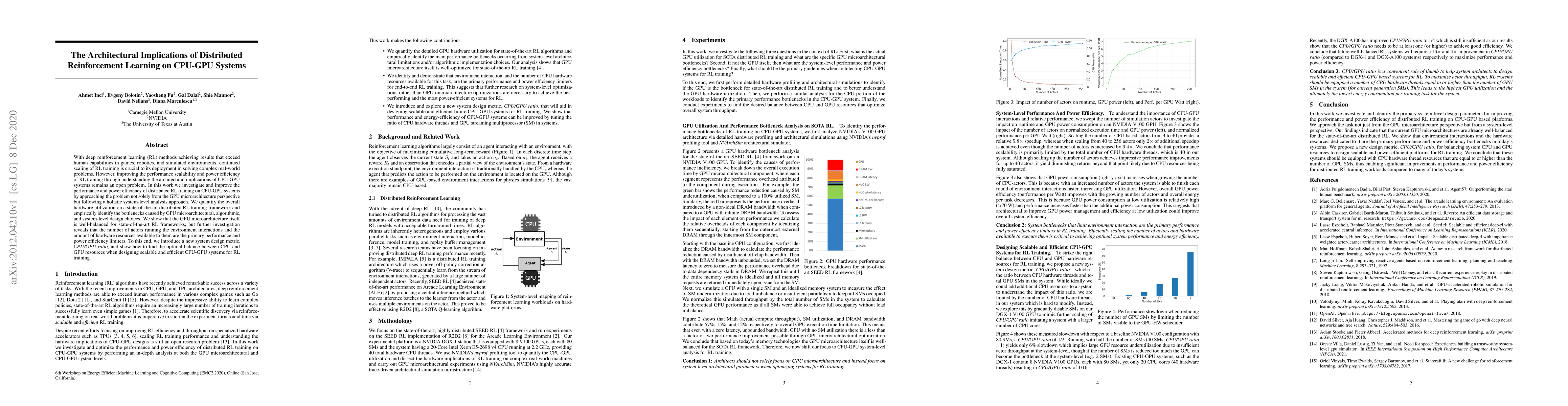 This paper explores how distributed reinforcement learning (RL) training on CPU-GPU systems can be optimized for performance and power efficiency. It identifies that while GPU microarchitecture is well-suited, bottlenecks arise from the number of environment interaction actors and hardware resource allocation, leading to the introduction of a CPU/GPU ratio metric for optimal resource balancing.
