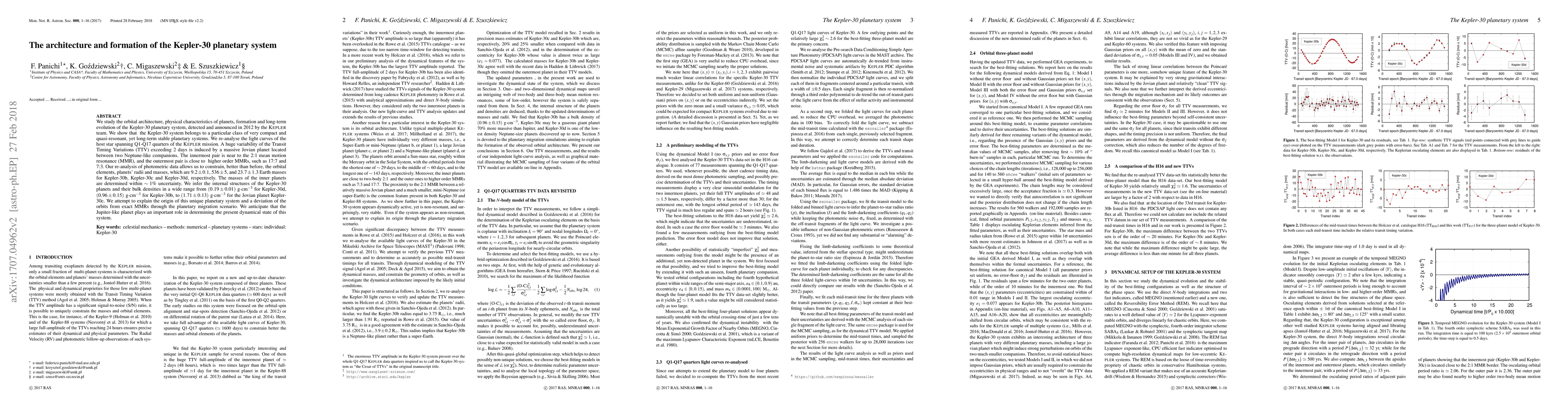 We study the orbital architecture, physical characteristics of planets, formation and long-term evolution of the Kepler-30 planetary system, detected and announced in 2012 by the KEPLER team. We show that the Kepler-30 system belongs to a particular class of very compact and quasi-resonant, yet long-term stable planetary systems. We re-analyse the light curves of the host star spanning Q1-Q17 quarters of the KEPLER mission. A huge variability of the Transit Timing Variations (TTV) exceeding 2 days is induced by a massive Jovian planet located between two Neptune-like companions. The innermost pair is near to the 2:1 mean motion resonance (MMR), and the outermost pair is close to higher order MMRs, such as 17:7 and 7:3. Our re-analysis of photometric data allows us to constrain, better than before, the orbital elements, planets' radii and masses, which are $9.2 \pm 0.1$, $536 \pm 5$, and $23.7 \pm 1.3$ Earth masses for Kepler-30b, Kepler-30c and Kepler-30d, respectively. The masses of the inner planets are determined within $\sim 1\%$ uncertainty. We infer the internal structures of the Kepler-30 planets and their bulk densities in a wide range from $ (0.19 \pm 0.01)$ g$\cdot$cm$^{-3}$ for Kepler-30d, $(0.96\pm0.15)$ g$\cdot$cm$^{-3}$ for Kepler-30b, to $(1.71 \pm 0.13)$ g$\cdot$cm$^{-3}$ for the Jovian planet Kepler-30c. We attempt to explain the origin of this unique planetary system and a deviation of the orbits from exact MMRs through the planetary migration scenario. We anticipate that the Jupiter-like planet plays an important role in determining the present dynamical state of this system.