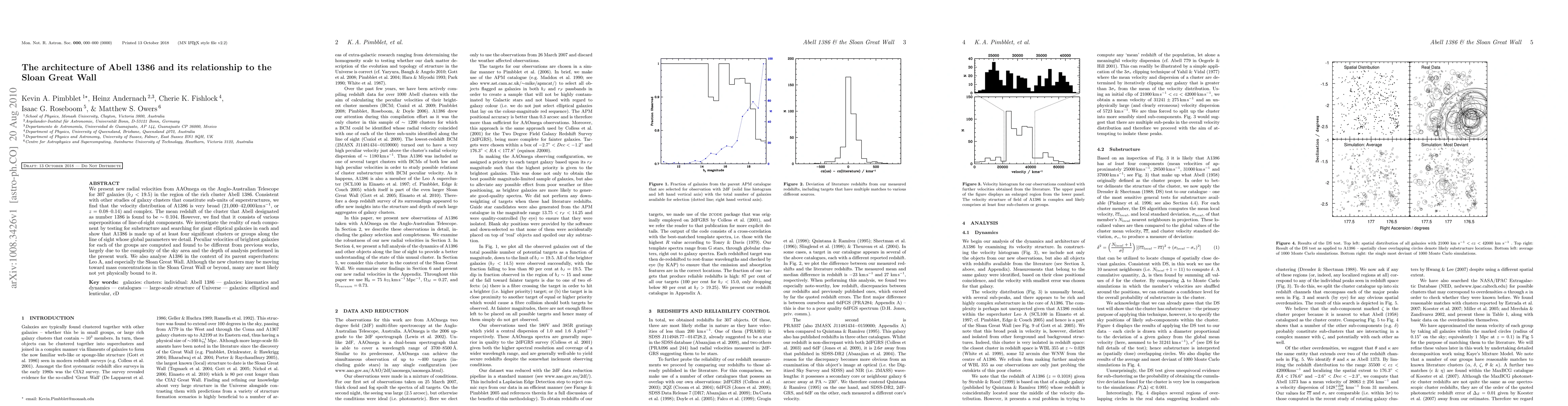 We present new radial velocities from AAOmega on the Anglo-Australian Telescope for 307 galaxies (b_J < 19.5) in the region of the rich cluster Abell 1386. Consistent with other studies of galaxy clusters that constitute sub-units of superstructures, we find that the velocity distribution of A1386 is very broad (21,000--42,000 kms^-1, or z=0.08--0.14) and complex. The mean redshift of the cluster that Abell designated as number 1386 is found to be ~0.104. However, we find that it consists of various superpositions of line-of-sight components. We investigate the reality of each component by testing for substructure and searching for giant elliptical galaxies in each and show that A1386 is made up of at least four significant clusters or groups along the line of sight whose global parameters we detail. Peculiar velocities of brightest galaxies for each of the groups are computed and found to be different from previous works, largely due to the complexity of the sky area and the depth of analysis performed in the present work. We also analyse A1386 in the context of its parent superclusters: Leo A, and especially the Sloan Great Wall. Although the new clusters may be moving toward mass concentrations in the Sloan Great Wall or beyond, many are most likely not yet physically bound to it.