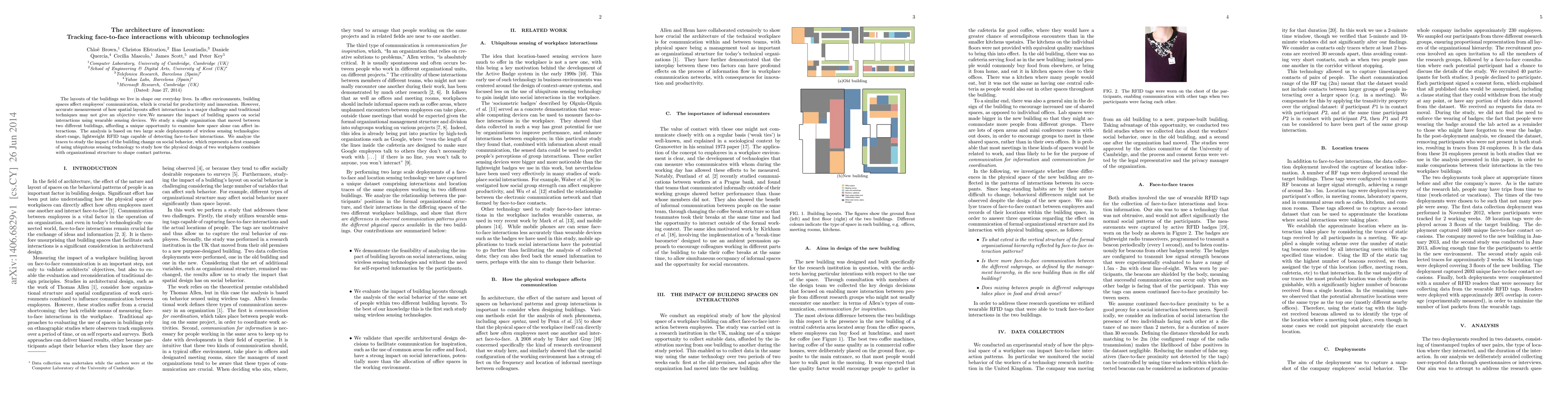 This paper explores how spatial layouts in office environments influence employees' face-to-face interactions using RFID technology. By comparing interactions in two different buildings, the study reveals how physical design and organizational structure shape social behavior and innovation.