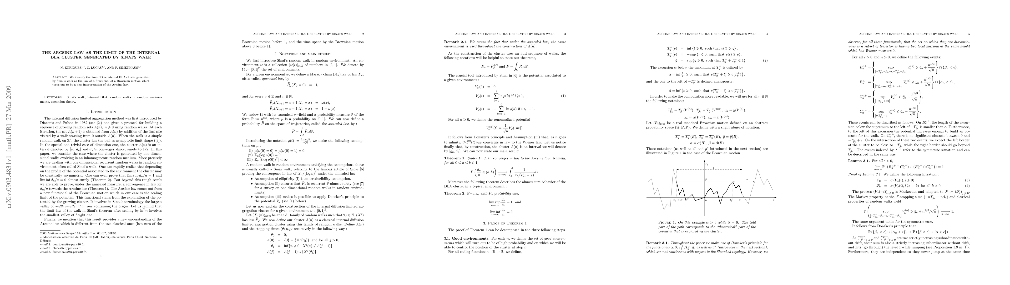 We identify the limit of the internal DLA cluster generated by Sinai's walk as the law of a functional of a Brownian motion which turns out to be a new interpretation of the Arcsine law.