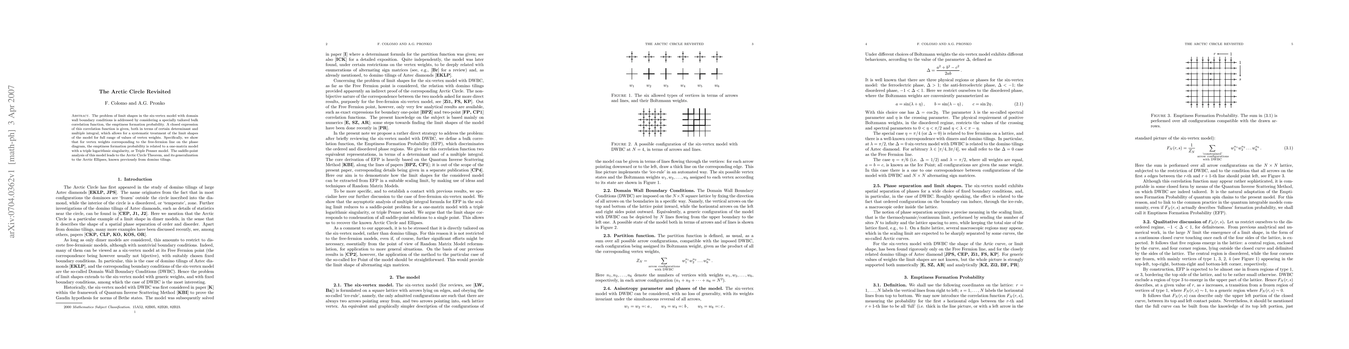 The problem of limit shapes in the six-vertex model with domain wall boundary conditions is addressed by considering a specially tailored bulk correlation function, the emptiness formation probability. A closed expression of this correlation function is given, both in terms of certain determinant and multiple integral, which allows for a systematic treatment of the limit shapes of the model for full range of values of vertex weights. Specifically, we show that for vertex weights corresponding to the free-fermion line on the phase diagram, the emptiness formation probability is related to a one-matrix model with a triple logarithmic singularity, or Triple Penner model. The saddle-point analysis of this model leads to the Arctic Circle Theorem, and its generalization to the Arctic Ellipses, known previously from domino tilings.
