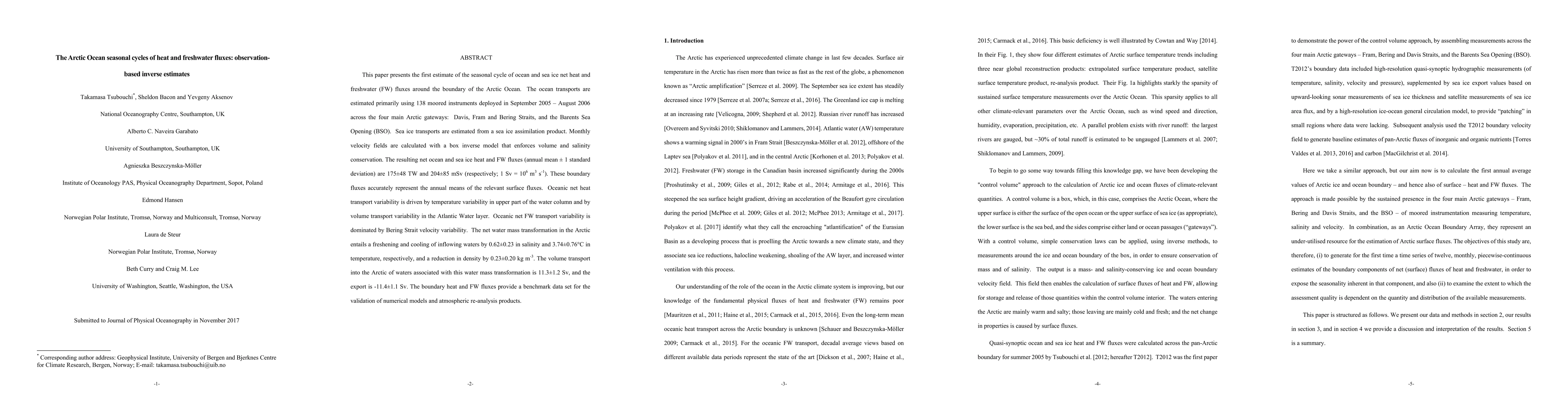 This study estimates the seasonal cycles of heat and freshwater fluxes around the Arctic Ocean's boundary using moored instruments and sea ice data, finding annual mean net heat and freshwater fluxes of 175±48 TW and 204±85 mSv, respectively, and providing a benchmark for model validation.