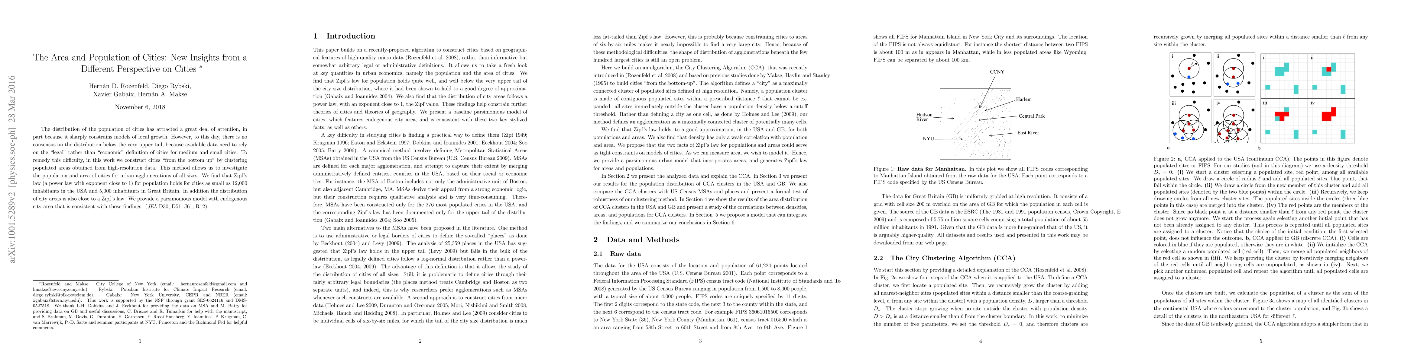 This research constructs cities 'from the bottom up' using high-resolution data clustering, revealing Zipf's law for population applies to cities as small as 12,000 in the US and 5,000 in the UK. The study also finds city area distribution follows a similar power law, proposing a model consistent with these findings.