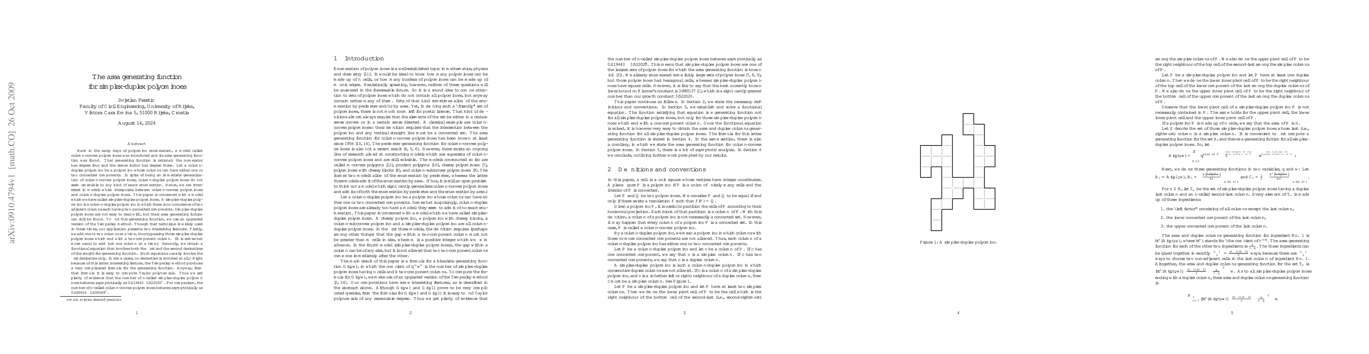 Back in the early days of polyomino enumeration, a model called column-convex polyominoes was introduced and its area generating function was found. That generating function is rational: the numerator has degree four and the denominator has degree three. Let a column-duplex polyomino be a polyomino whose columns can have either one or two connected components. A simplex-duplex polyomino is a column-duplex polyomino in which there is no occurrence of two adjacent columns each having two connected components. Simplex-duplex polyominoes are not easy to deal with, but their area generating function can still be found. To find this generating function, we use an upgraded version of the Temperley method. Though that technique is widely used in these times, our application presents two interesting features. Firstly, we add one or two columns at a time, thus bypassing those simplex-duplex polyominoes which end with a two-component column. (It is somewhat more usual to add just one column at a time.) Secondly, we obtain a functional equation that involves both the first and the second derivatives of the sought-for generating function. (Such equations usually involve the first derivative only. In some cases, no derivative is involved at all.) Right because of this latter interesting feature, the Temperley method produces a very complicated formula for the generating function. Anyway, from that formula it is easy to compute Taylor polynomials. Thus we get plenty of evidence that the number of n-celled simplex-duplex polyominoes behaves asymptotically as 0.119443*3.522020^n. For comparison, the number of n-celled column-convex polyominoes behaves asymptotically as 0.180916*3.205569^n.