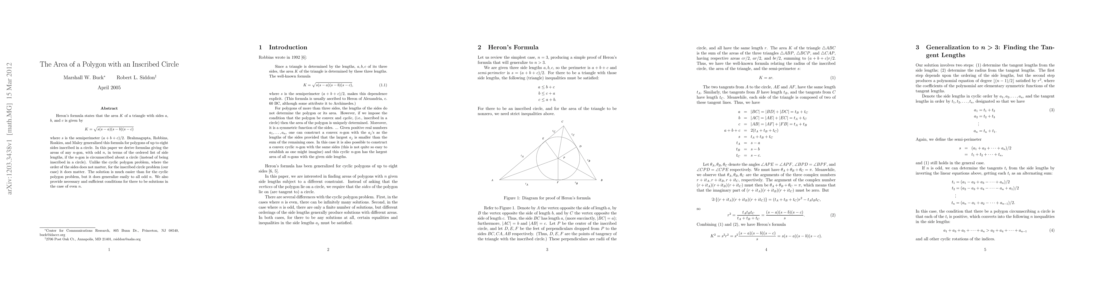 This paper presents new formulas for calculating the area of odd-sided polygons circumscribed about a circle, using ordered side lengths. It contrasts this with the cyclic polygon problem, noting the side order significance in the inscribed circle case. The method generalizes to all odd-sided polygons, with additional conditions outlined for even-sided polygons.