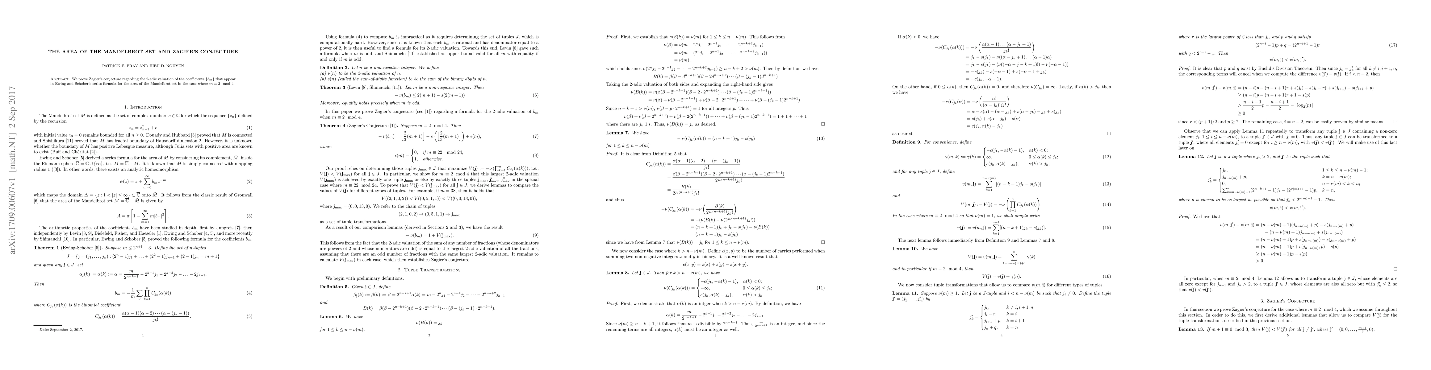 Summary: This paper proves Zagier's conjecture on the 2-adic valuation of specific coefficients in Ewing and Schober's series formula for the area of the Mandelbrot set, focusing on coefficients where $m\equiv 2 \mod 4$. The result connects deep number theory with fractal geometry.