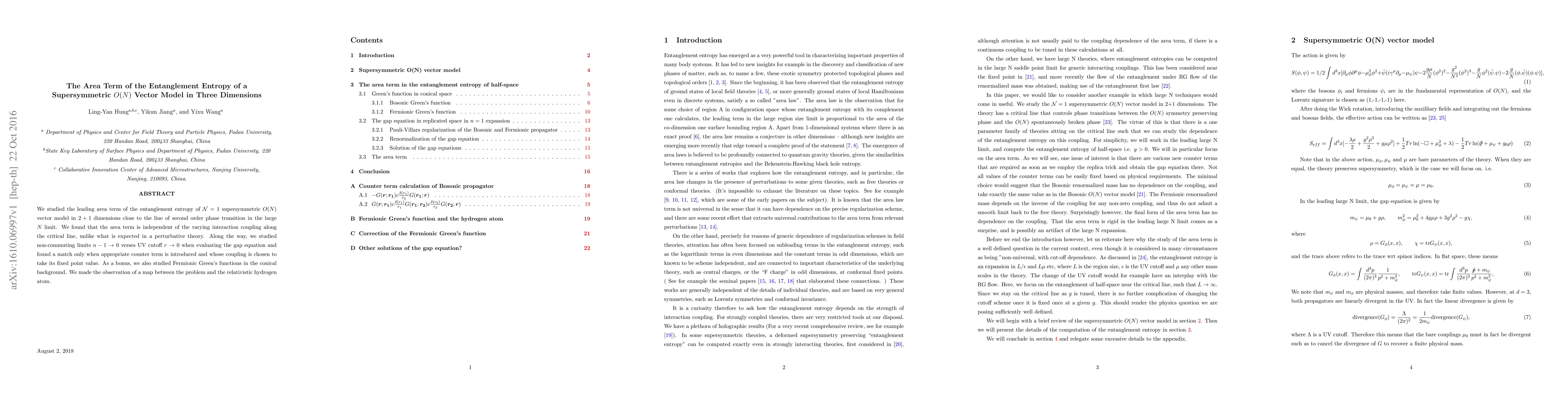 This paper investigates the entanglement entropy's area term in a supersymmetric $O(N)$ vector model in 3D near a second-order phase transition, finding it independent of interaction coupling. It also explores non-commuting limits and introduces a counter term to match results, revealing a connection between the problem and the relativistic hydrogen atom.