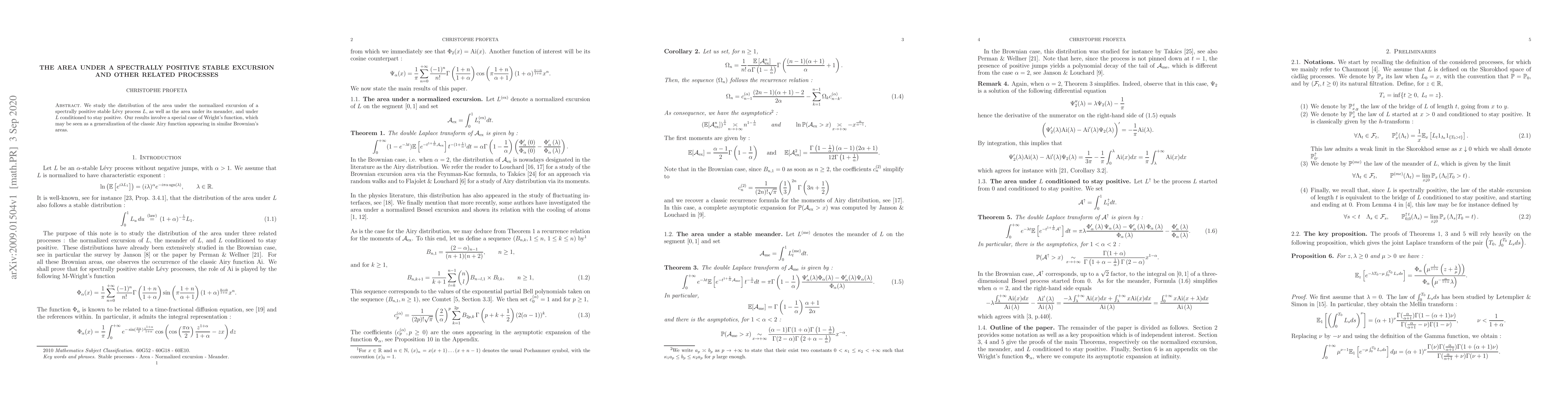 We study the distribution of the area under the normalized excursion of a spectrally positive stable L{\'e}vy process L, as well as the area under its meander, and under L conditioned to stay positive. Our results involve a special case of Wright's function, which may be seen as a generalization of the classic Airy function appearing in similar Brownian's areas.