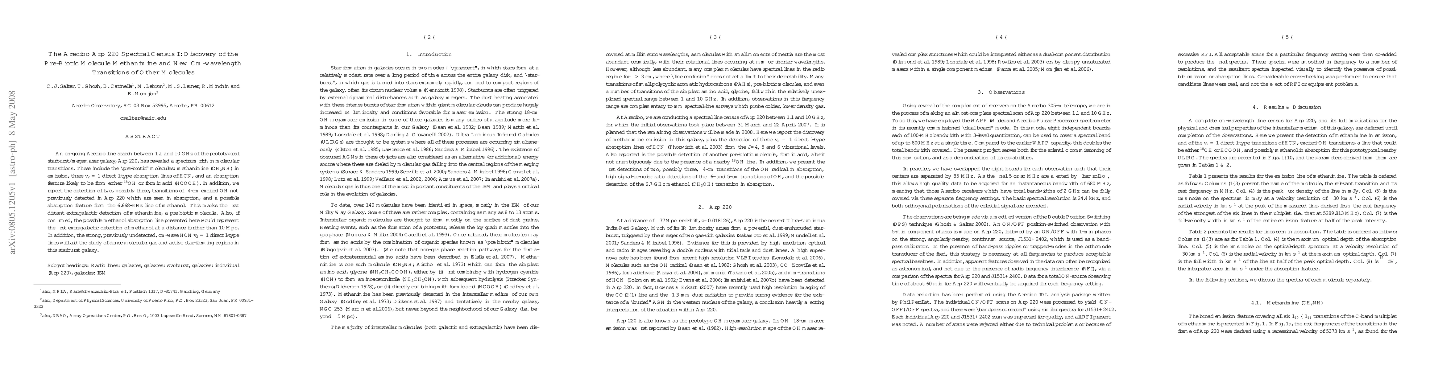 An on-going Arecibo line search between 1.1 and 10 GHz of the prototypical starburst/megamaser galaxy, Arp 220, has revealed a spectrum rich in molecular transitions. These include the ``pre-biotic'' molecules: methanimine (CH$_{2}$NH) in emission, three $v_{2}=1$ direct l-type absorption lines of HCN, and an absorption feature likely to be from either $^{18}$OH or formic acid (HCOOH). In addition, we report the detection of two, possibly three, transitions of $\lambda$4-cm excited OH not previously detected in Arp~220 which are seen in absorption, and a possible absorption feature from the 6.668-GHz line of methanol. This marks the first distant extragalactic detection of methanimine, a pre-biotic molecule. Also, if confirmed, the possible methanol absorption line presented here would represent the first extragalactic detection of methanol at a distance further than 10 Mpc. In addition, the strong, previously undetected, cm-wave HCN $v_{2}=1$ direct l-type lines will aid the study of dense molecular gas and active star-forming regions in this starburst galaxy.