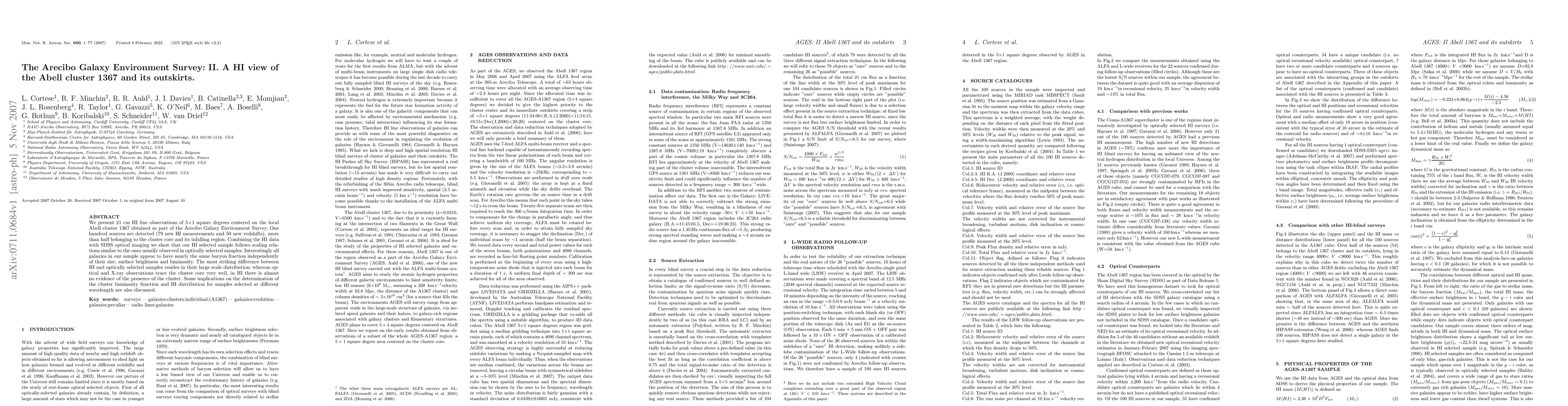 The Arecibo Galaxy Environment Survey (AGES) conducted 21 cm HI line observations of a 5x1 square degree area centered on the Abell cluster 1367, detecting 100 HI sources, 79 new HI measurements, and 50 new redshifts. The study combined HI data with SDSS optical imaging to analyze scaling relations and baryon fractions in HI-selected and optically-selected samples.