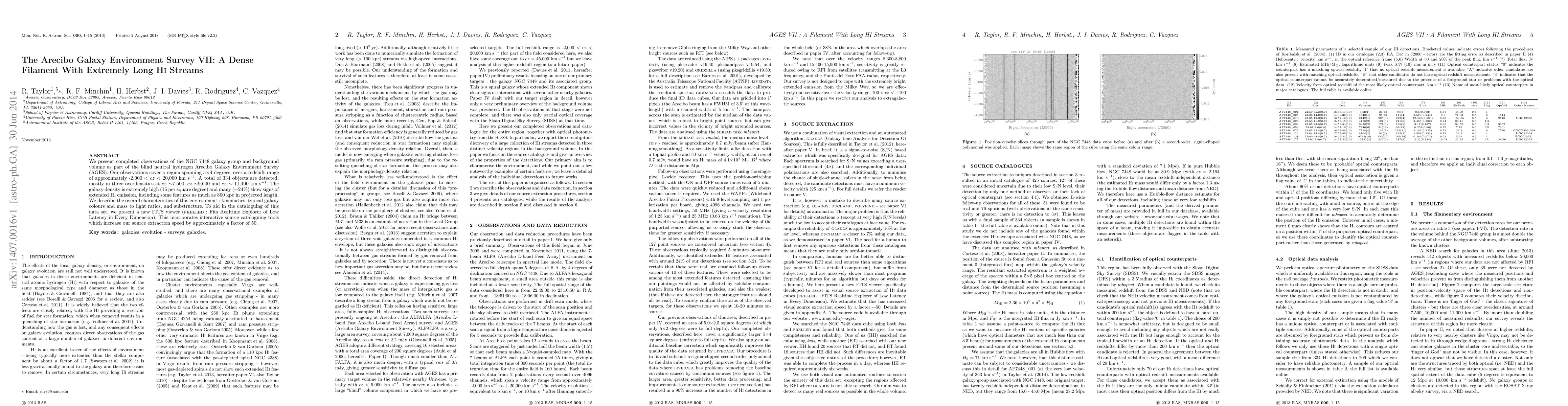 The Arecibo Galaxy Environment Survey VII reveals a dense NGC 7448 galaxy group with extremely long HI streams, featuring high galaxy density and extended HI emissions up to 800 kpc. A new FITS viewer is introduced to enhance data cataloguing efficiency.