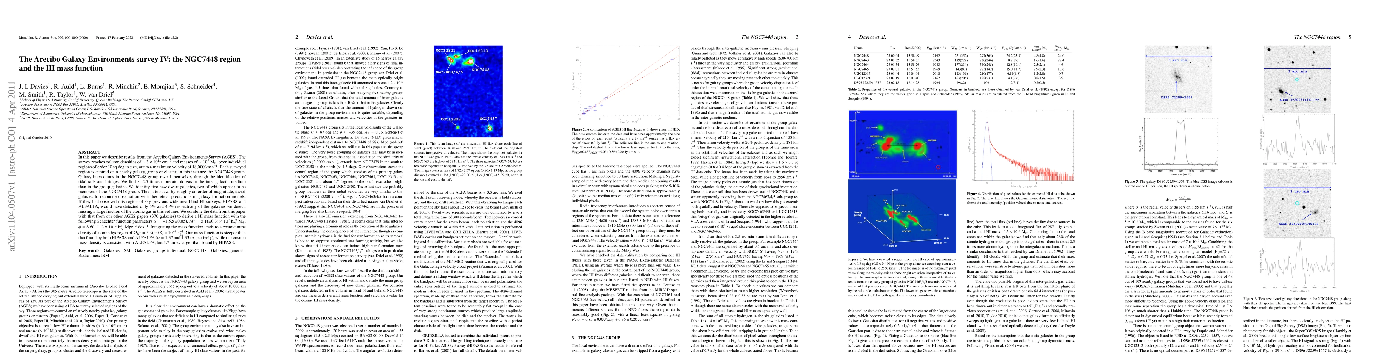 In this paper we describe results from the Arecibo Galaxy Environments Survey (AGES). The survey reaches column densities of ~3x10^18 cm^-2 and masses of ~10^7 M_O, over individual regions of order 10 sq deg in size, out to a maximum velocity of 18,000 km s^-1. Each surveyed region is centred on a nearby galaxy, group or cluster, in this instance the NGC7448 group. Galaxy interactions in the NGC7448 group reveal themselves through the identification of tidal tails and bridges. We find ~2.5 times more atomic gas in the inter-galactic medium than in the group galaxies. We identify five new dwarf galaxies, two of which appear to be members of the NGC7448 group. This is too few, by roughly an order of magnitude, dwarf galaxies to reconcile observation with theoretical predictions of galaxy formation models. If they had observed this region of sky previous wide area blind HI surveys, HIPASS and ALFALFA, would have detected only 5% and 43% respectively of the galaxies we detect, missing a large fraction of the atomic gas in this volume. We combine the data from this paper with that from our other AGES papers (370 galaxies) to derive a HI mass function with the following Schechter function parameters alpha=-1.52+/-0.05, M^*=5.1+/-0.3x10^9 h_72^-2 M_O, phi=8.6+/-1.1x10-3 h_72^3 Mpc^-3 dex-1. Integrating the mass function leads to a cosmic mass density of atomic hydrogen of Omega_HI=5.3+/-0.8x10^-4 h_72^-1. Our mass function is steeper than that found by both HIPASS and ALFALFA (alpha=1.37 and 1.33 respectively), while our cosmic mass density is consistent with ALFALFA, but 1.7 times larger than found by HIPASS.
