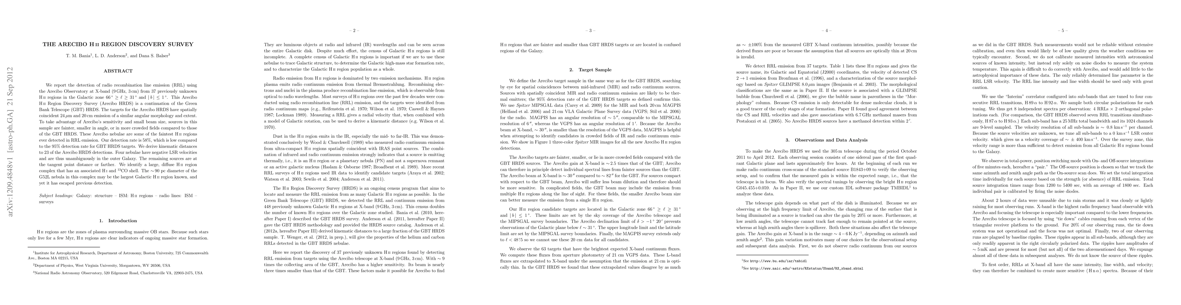 The Arecibo HII Region Discovery Survey detected 37 previously unknown HII regions using Arecibo Observatory's X-band, identifying some of the faintest HII regions ever in radio recombination line emission. The survey found a large, diffuse HII region complex, including the potentially largest known Galactic HII region, G52L.