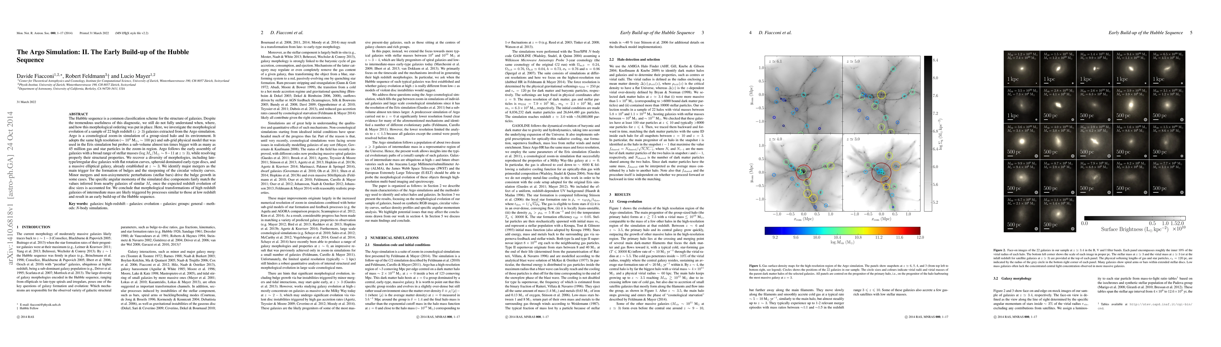The Hubble sequence is a common classification scheme for the structure of galaxies. Despite the tremendous usefulness of this diagnostic, we still do not fully understand when, where, and how this morphological ordering was put in place. Here, we investigate the morphological evolution of a sample of 22 high redshift ($z\geq3$) galaxies extracted from the Argo simulation. Argo is a cosmological zoom-in simulation of a group-sized halo and its environment. It adopts the same high resolution ($\sim10^4$ M$_\odot$, $\sim100$ pc) and sub-grid physical model that was used in the Eris simulation but probes a sub-volume almost ten times bigger with as many as 45 million gas and star particles in the zoom-in region. Argo follows the early assembly of galaxies with a broad range of stellar masses ($\log M_{\star}/{\rm M}_{\odot}\sim8-11$ at $z\simeq3$), while resolving properly their structural properties. We recover a diversity of morphologies, including late-type/irregular disc galaxies with flat rotation curves, spheroid dominated early-type discs, and a massive elliptical galaxy, already established at $z\sim3$. We identify major mergers as the main trigger for the formation of bulges and the steepening of the circular velocity curves. Minor mergers and non-axisymmetric perturbations (stellar bars) drive the bulge growth in some cases. The specific angular momenta of the simulated disc components fairly match the values inferred from nearby galaxies of similar $M_{\star}$ once the expected redshift evolution of disc sizes is accounted for. We conclude that morphological transformations of high redshift galaxies of intermediate mass are likely triggered by processes similar to those at low redshift and result in an early build-up of the Hubble sequence.