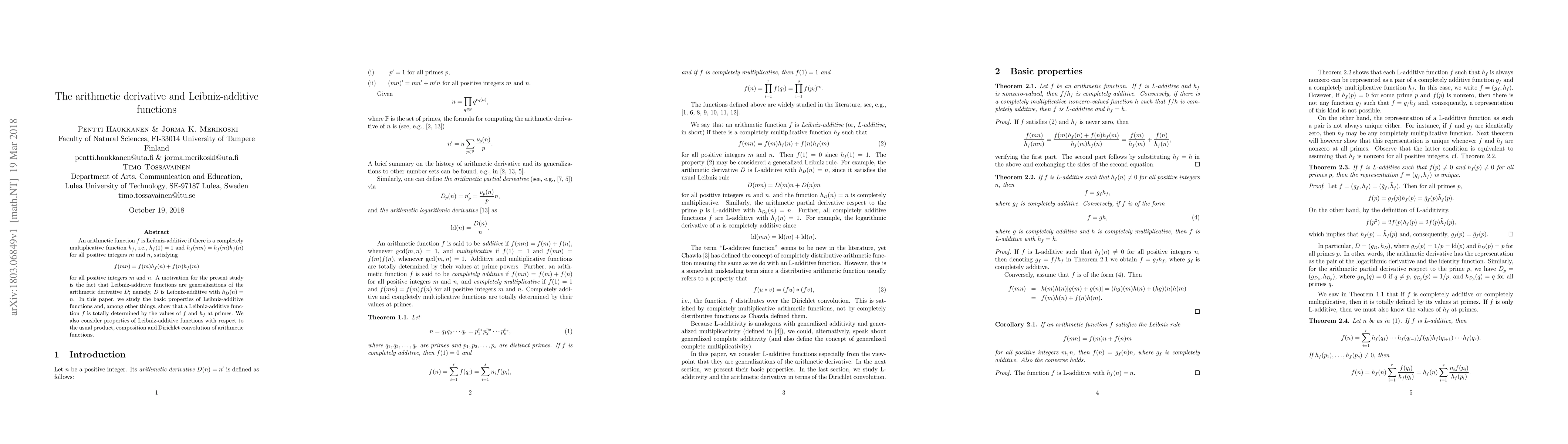 This paper explores the properties of Leibniz-additive functions, which generalize the arithmetic derivative, and demonstrates that such functions are fully determined by their values at primes. It also examines their behavior under product, composition, and Dirichlet convolution.