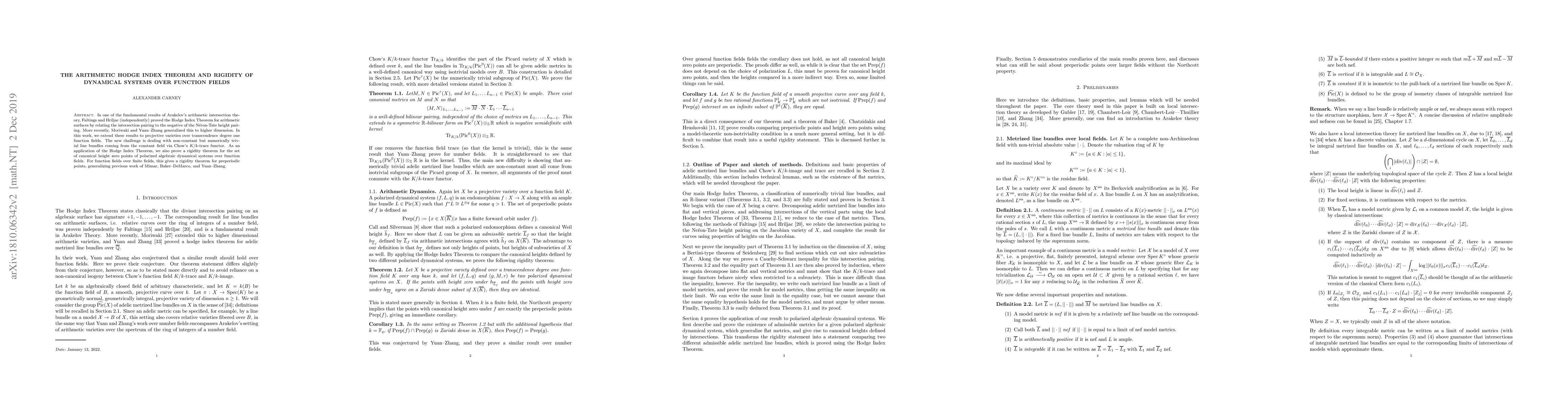 This paper extends the arithmetic Hodge Index Theorem to projective varieties over transcendence degree one function fields, addressing challenges from numerically trivial line bundles. As an application, it proves a rigidity theorem for canonical height zero points in polarized algebraic dynamical systems over function fields, generalizing prior results on preperiodic points over finite fields.