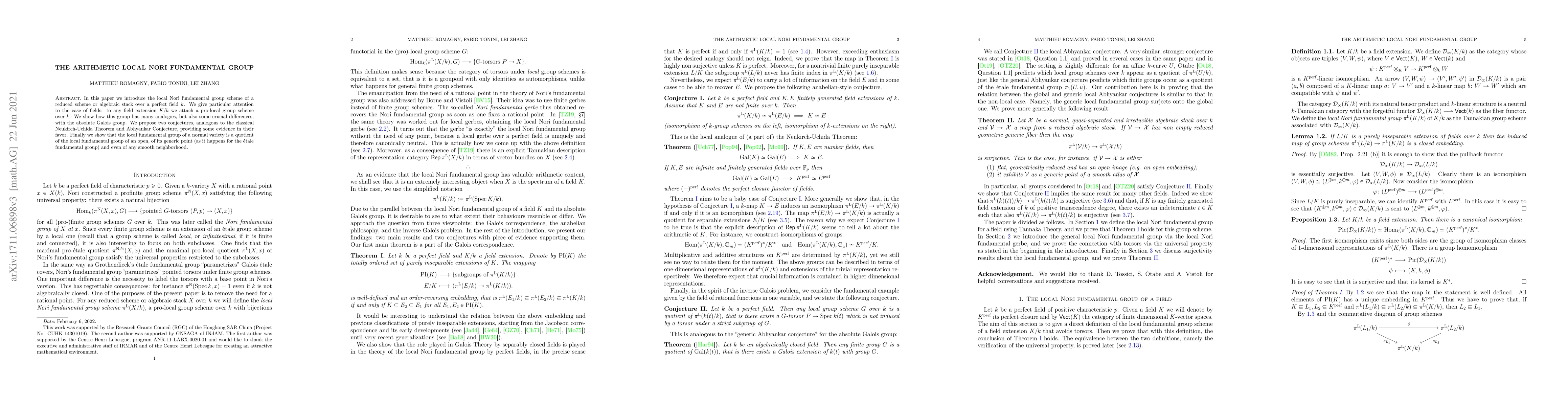 The paper introduces the local Nori fundamental group scheme for reduced schemes or algebraic stacks over a perfect field, focusing on field extensions and comparing it to the absolute Galois group, proposing conjectures analogous to the Neukirch-Uchida Theorem and Abhyankar Conjecture.