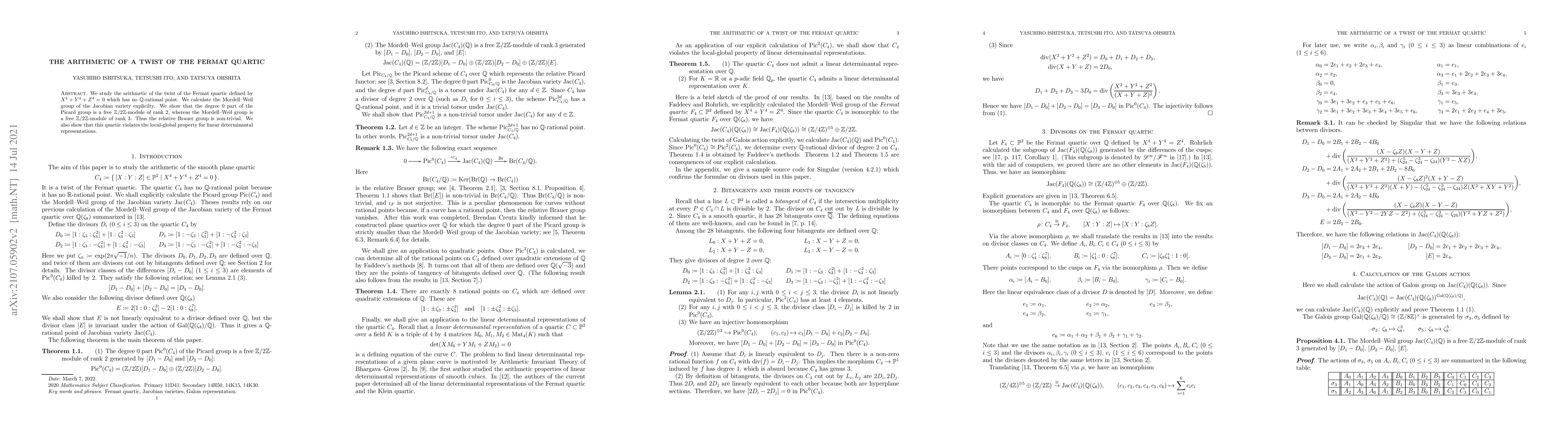 We study the arithmetic of the twist of the Fermat quartic defined by $X^4 + Y^4 + Z^4 = 0$ which has no $\mathbb{Q}$-rational point. We calculate the Mordell--Weil group of the Jacobian variety explicilty. We show that the degree $0$ part of the Picard group is a free $\mathbb{Z}/2\mathbb{Z}$-module of rank $2$, whereas the Mordell--Weil group is a free $\mathbb{Z}/2\mathbb{Z}$-module of rank $3$. Thus the relative Brauer group is non-trivial. We also show that this quartic violates the local-global property for linear determinantal representations.