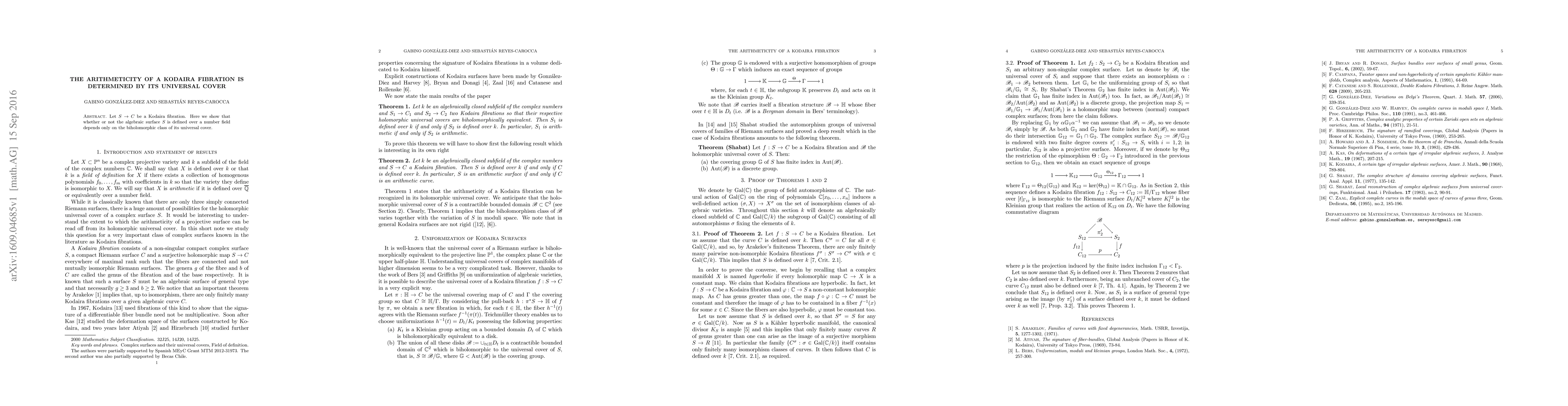 This research demonstrates that the arithmetic nature of a Kodaira fibration, specifically whether it's defined over a number field, can be determined solely by the biholomorphic class of its universal cover.