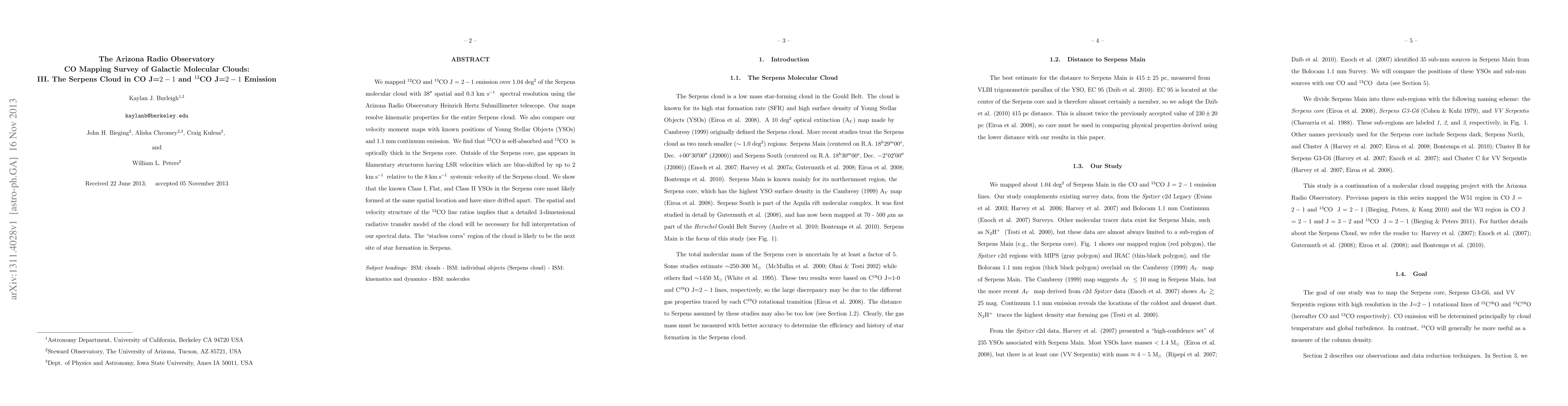 This study maps CO emission in the Serpens molecular cloud, revealing kinematic properties, self-absorption of 12CO, and optical thickening of 13CO in its core. The data suggests that star formation is likely to occur in the starless core region of the cloud.