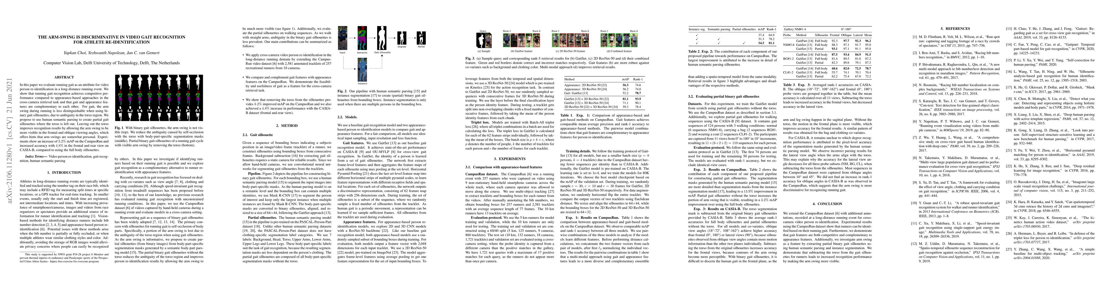 This paper explores running gait as a discriminative feature for athlete re-identification in video, demonstrating competitive performance against appearance-based methods. By excluding the torso in partial gait silhouettes, the arm swing becomes more visible, enhancing recognition accuracy by 3.2% mAP on CampusRun and 4.8% in frontal and rear views on CASIA-B.