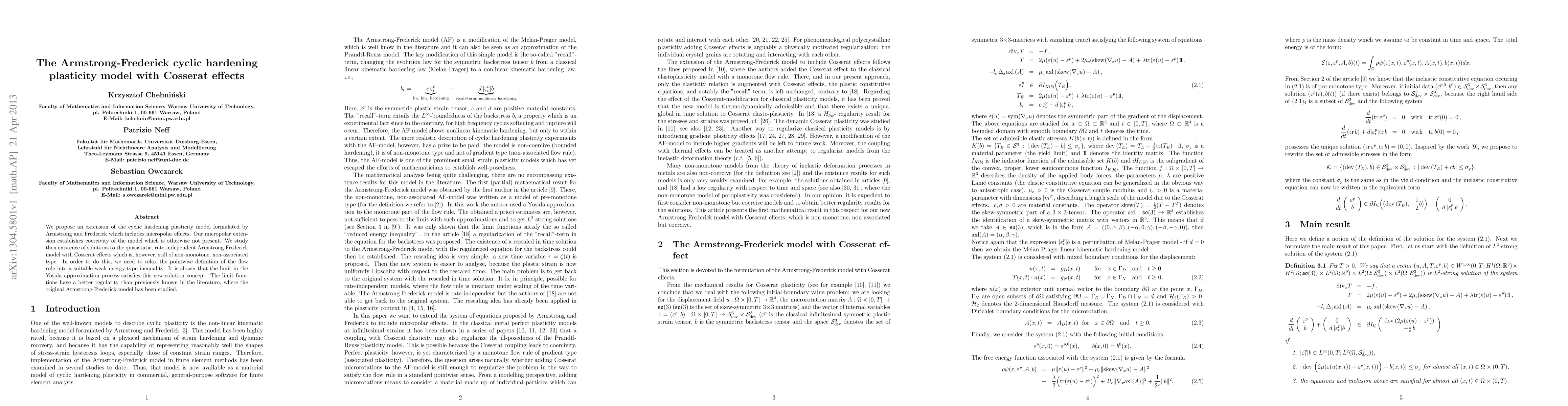 We propose an extension of the cyclic hardening plasticity model formulated by Armstrong and Frederick which includes micropolar effects. Our micropolar extension establishes coercivity of the model which is otherwise not present. We study then existence of solutions to the quasistatic, rate-independent Armstrong-Frederick model with Cosserat effects which is, however, still of non-monotone, non-associated type. In order to do this, we need to relax the pointwise definition of the flow rule into a suitable weak energy-type inequality. It is shown that the limit in the Yosida approximation process satisfies this new solution concept. The limit functions have a better regularity than previously known in the literature, where the original Armstrong-Frederick model has been studied.