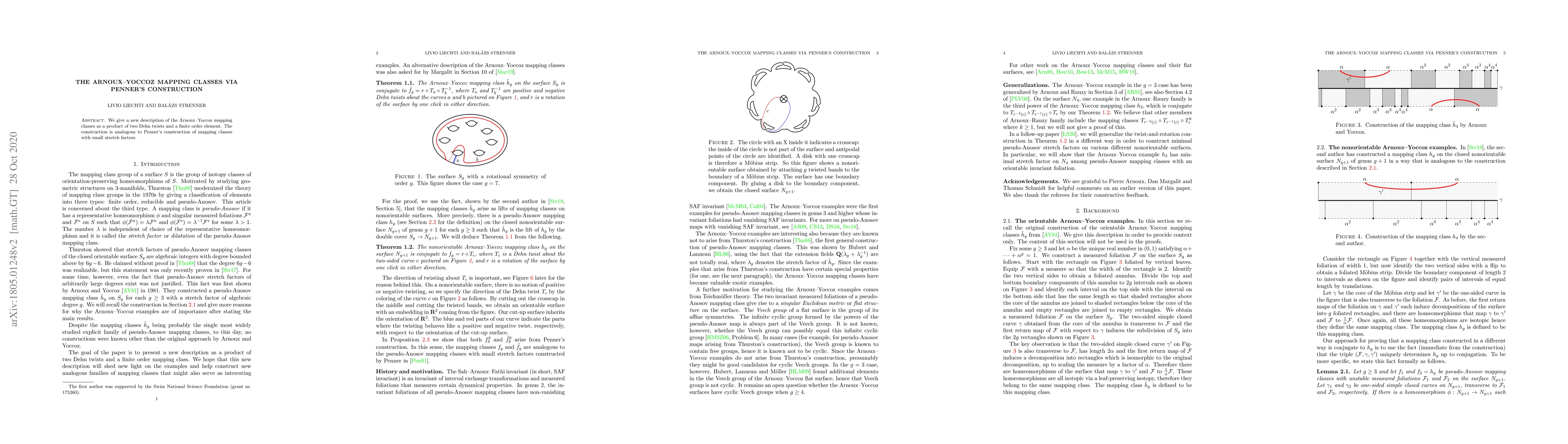 Summary: This paper presents a novel description of Arnoux-Yoccoz mapping classes through a product of two Dehn twists and a finite order element, mirroring Penner's construction method for mapping classes with minimal distortion.