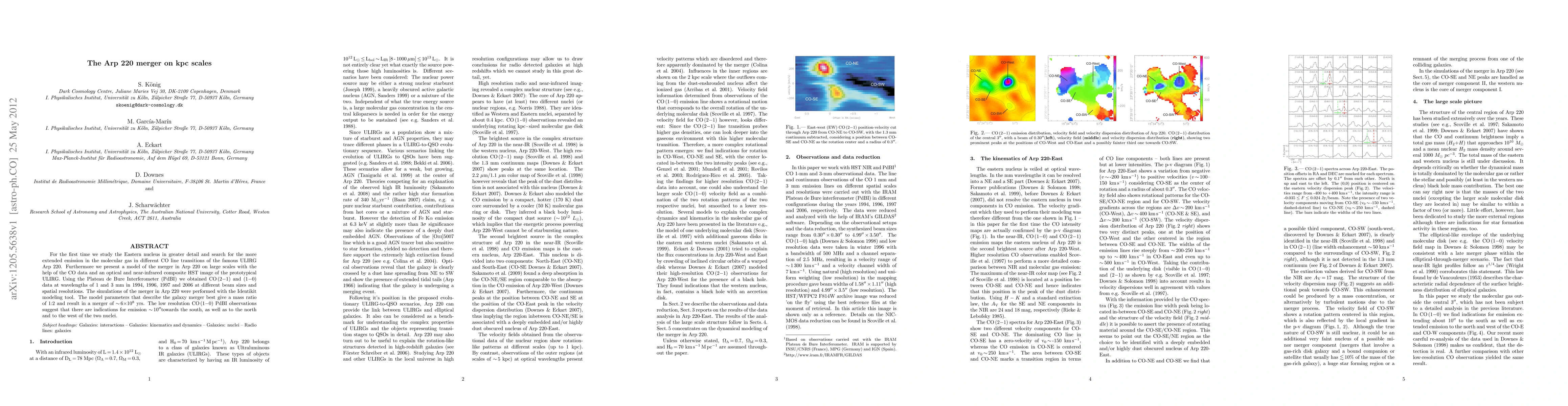 For the first time we study the Eastern nucleus in greater detail and search for the more extended emission in the molecular gas in different CO line transitions of the famous ULIRG Arp 220. Furthermore we present a model of the merger in Arp 220 on large scales with the help of the CO data and an optical and near-infrared composite HST image of the prototypical ULIRG. Using the Plateau de Bure Interferometer (PdBI) we obtained CO(2-1) and (1-0) data at wavelengths of 1 and 3 mm in 1994, 1996, 1997 and 2006 at different beam sizes and spatial resolutions. The simulations of the merger in Arp 220 were performed with the Identikit modeling tool. The model parameters that describe the galaxy merger best give a mass ratio of 1:2 and result in a merger of ~6x10^8 yrs. The low resolution CO(1-0) PdBI observations suggest that there are indications for emission ~10" towards the south, as well as to the north and to the west of the two nuclei.