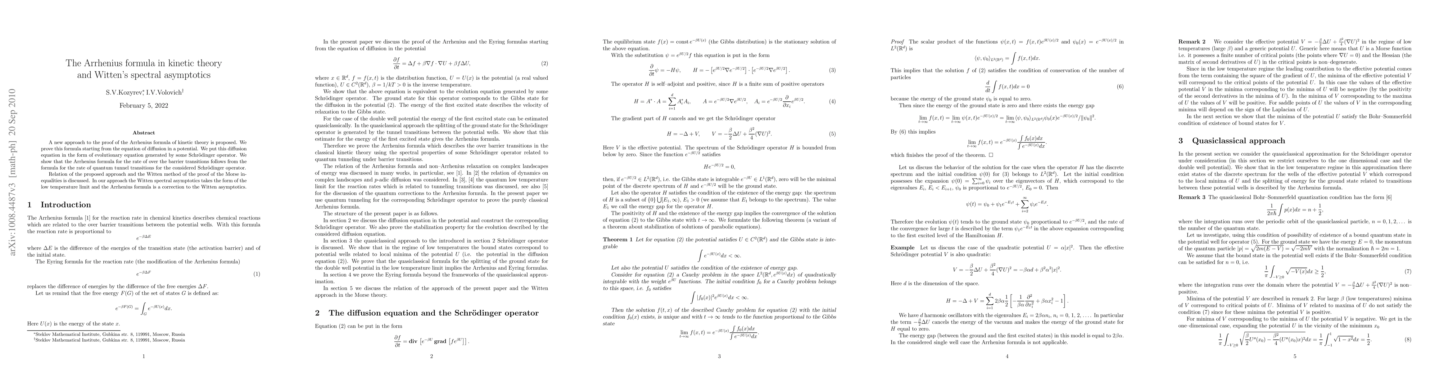 A new approach to the proof of the Arrhenius formula of kinetic theory is proposed. We prove this formula starting from the equation of diffusion in a potential. We put this diffusion equation in the form of evolutionary equation generated by some Schroedinger operator. We show that the Arrhenius formula for the rate of over the barrier transitions follows from the formula for the rate of quantum tunnel transitions for the considered Schroedinger operator. Relation of the proposed approach and the Witten method of the proof of the Morse inequalities is discussed. In our approach the Witten spectral asymptotics takes the form of the low temperature limit and the Arrhenius formula is a correction to the Witten asymptotics.