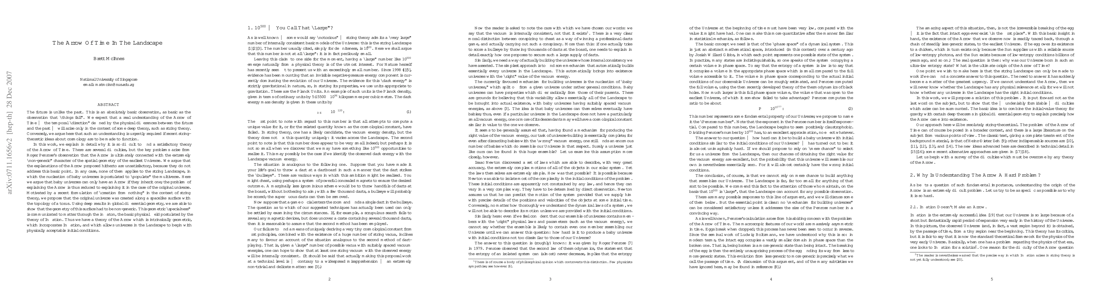 We argue that an understanding of the Arrow of Time is urgently required if recent string-theoretic ideas about cosmology are to be made to function. In the string Landscape, the nucleation of baby universes is postulated to "populate" the multiverse. Here we argue that baby universes can only have an Arrow if they \emph{inherit} one; the problem of explaining the Arrow is thus reduced to explaining it in the case of the original universe. Motivated by the Ooguri-Vafa-Verlinde formulation of "creation from nothing" in the context of string theory, we propose that the original universe was created along a spacelike surface with the topology of a torus. Using deep results in global differential geometry, we are able to show that the geometry of this surface had to be non-generic. This geometric "specialness" is communicated to matter through the inflaton. Thus we have a theory of the Arrow which is intrinsically geometric, which incorporates Inflation, and which allows universes in the Landscape to begin with physically acceptable initial conditions.